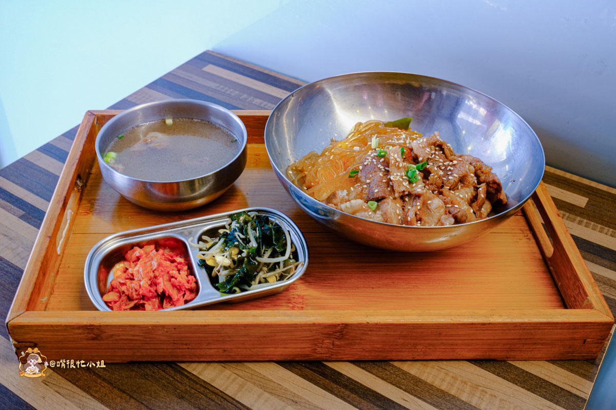 這是我們當天點的另一道人氣飯類。整份套餐會附湯、兩樣韓式小菜,鋼盆裝的飯一端上桌就香氣四溢。