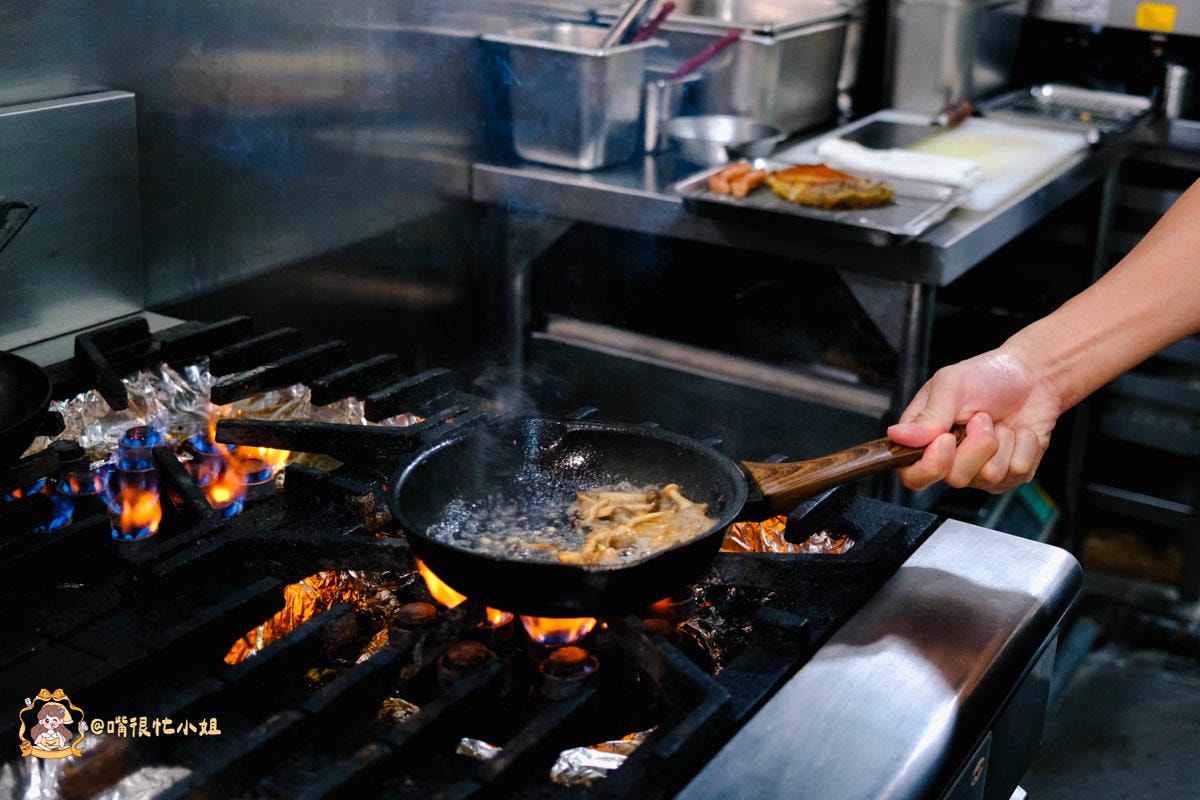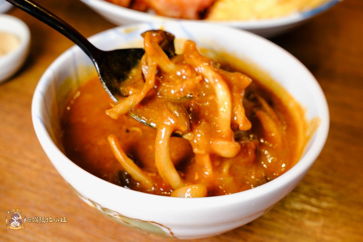 這盤我加了雙醬,等於一半特製日式、一半紅酒炒菇濃郁。紅酒醬是這家的記憶點:醬體更厚,鼻腔能聞到淡淡的酒香與菇的木質調,入口先是微酸再帶出濃郁與一點點辣度,和炸雞的油香很對味;碗裡的炒菇保留脆度,拌飯時會多一個「吱吱」的口感,越吃越開胃。