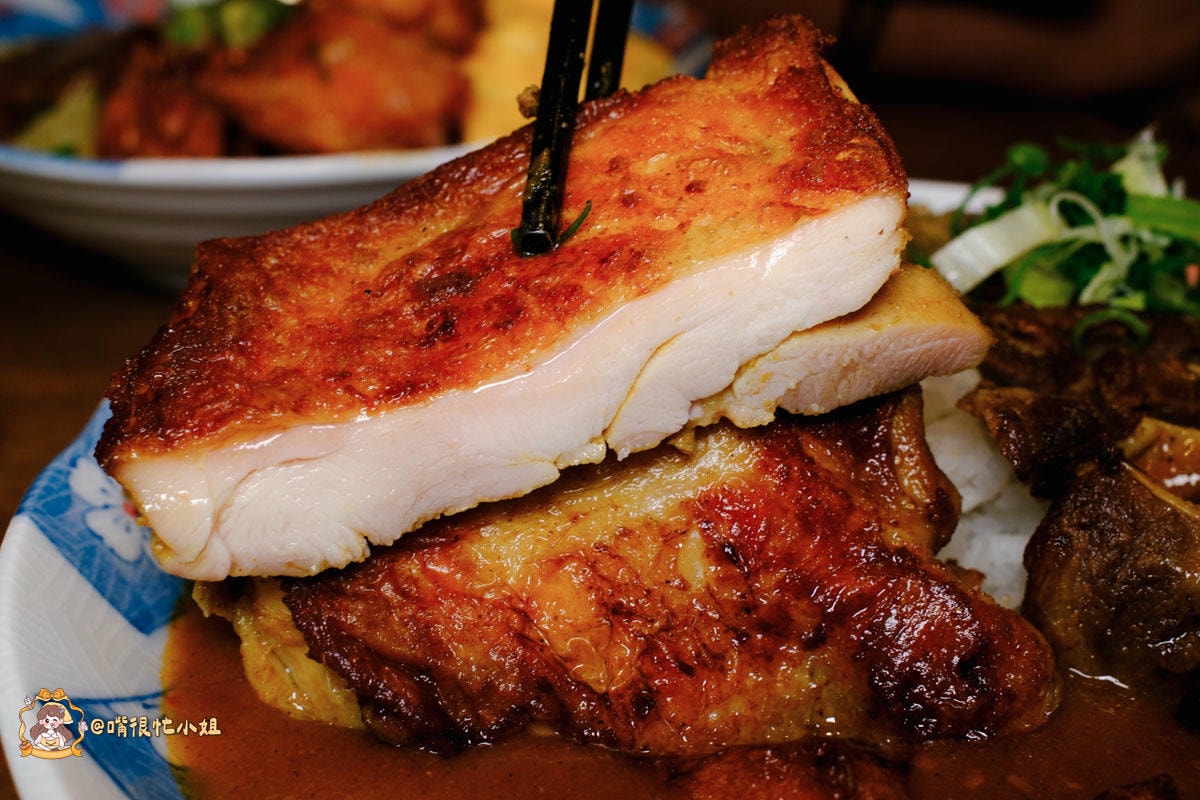 我另外加點台灣雞腿排 $130,等於把牛肉直接升級成雙拼肉。雞腿排是完整的大塊,皮煎到金黃起泡,筷子一壓會滲出肉汁;雞皮脆、雞肉厚實,吃得到腿肉的彈性,沾一點日式咖哩,甜香把雞油香包起來,讓整盤更耐吃。