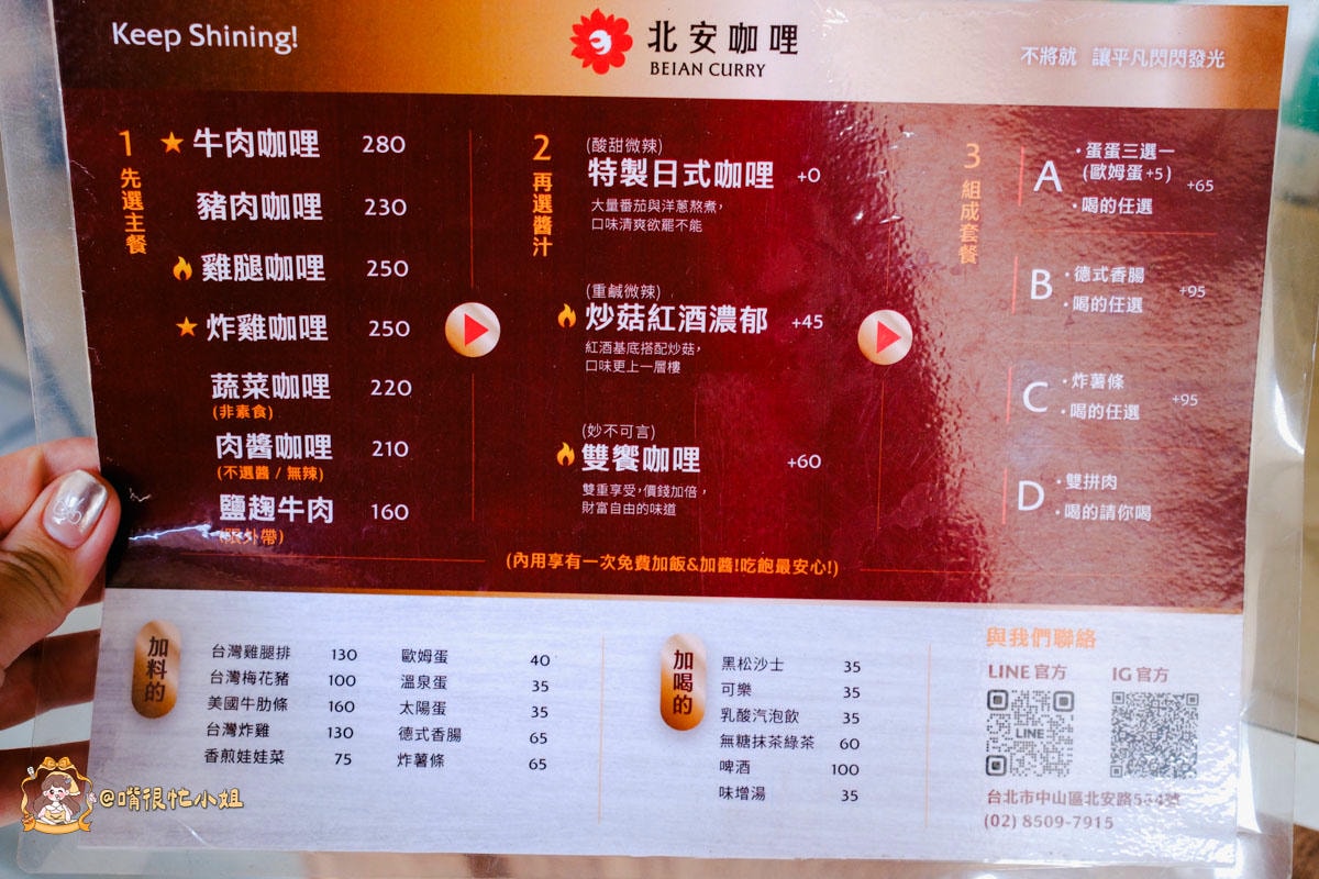 北安咖喱沒有花俏裝潢、也不走浮誇擺盤,卻用兩款個性明確的醬汁把咖哩的靈魂抓得很緊。日式咖哩勝在清爽耐吃、搭任何主餐都穩;紅酒炒菇則是香氣與厚度更前段,適合想要「重一點」的日子。肉品處理講究,牛有彈性、雞腿皮脆肉嫩,炸雞+歐姆蛋+雙醬是一口氣把香、脆、濃都收齊的組合。份量方面,單點就很足,內用還能再加一次飯與醬,CP 值自然跟著上來。難怪網路上會把它封為「大直最強咖哩」,在競爭激烈的北安路一帶,這種踏實的好味道,最禁得起回訪。