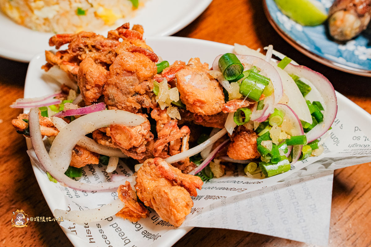 整隻蟹炸得外殼酥香、內肉保有鮮味,咬下去外層卡滋脆、裡面仍是蟹肉的嫩甜。搭配紫洋蔥與蔥花一起拌炒,吃起來多了一層清爽辛香,完全不膩口。蟹殼炸得像餅乾一樣脆,連腳邊都能直接啃;一口咬下,是搭啤酒的絕配。
