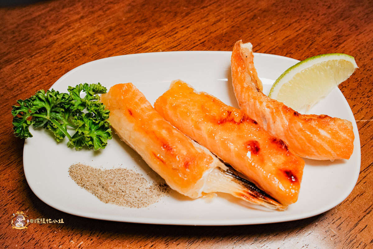 滿滿油脂的鮭魚腹,用炭火慢烤後,外層微焦、內裡仍保留豐盈脂香。第一口即感受到油脂在舌尖化開,魚肉甜味飽滿,留下的是鮭魚特有的豐潤與炭燒香氣的尾韻;擠上一旁附的檸檬片,更為口感增添另外一種滋味。