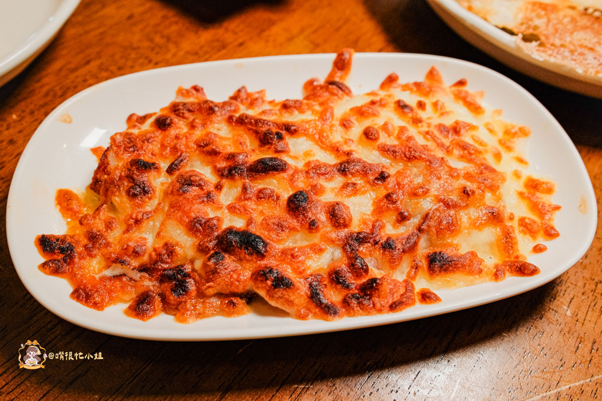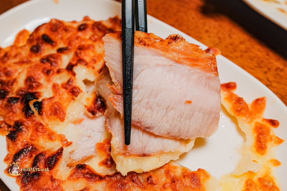 松阪豬厚切炭烤,外層微焦、肉質帶脆彈,上層鋪滿起司,焗烤後金黃焦香、牽絲到誇張,一口咬下是「焦香+鹹奶香+豬肉彈性」的完美組合,吃到會想再來一份!