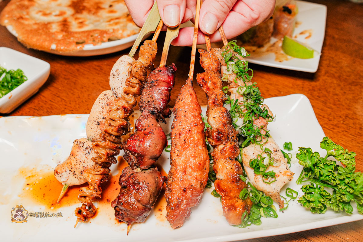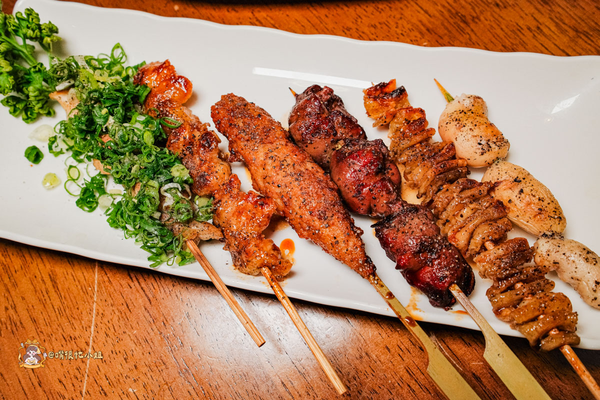 一整盤由左到右依序是蔥烤土雞串、雞尾、手打醬烤雞肉丸、雞肝、雞皮、雞佛,每一串都烤得恰到好處。