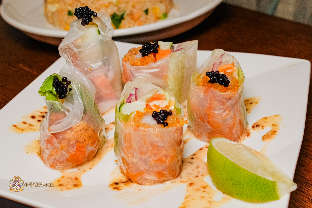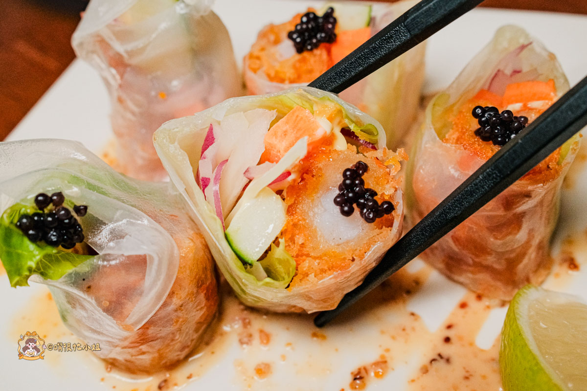 這道一上桌就超吸睛。透亮的越南春捲皮裡包著炸蝦、蟹肉棒、生菜與小黃瓜,頂端再放上一顆顆魚子醬,整體視覺感滿分。咬下那一口,先是魚子醬的鹹香,接著是炸蝦的香氣與蔬菜的清爽交錯,整體層次非常豐富,清爽又不油膩。