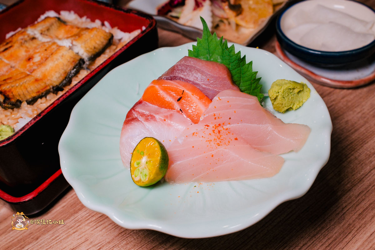 套餐附的刺身水準非常高!鮭魚、旗魚、鮪魚三種魚料厚切上桌,油花分布漂亮;鮭魚油脂在口中化開,旗魚紮實帶彈性,鮪魚則鮮味濃郁。搭配一點現磨芥末和金桔,非常開胃。