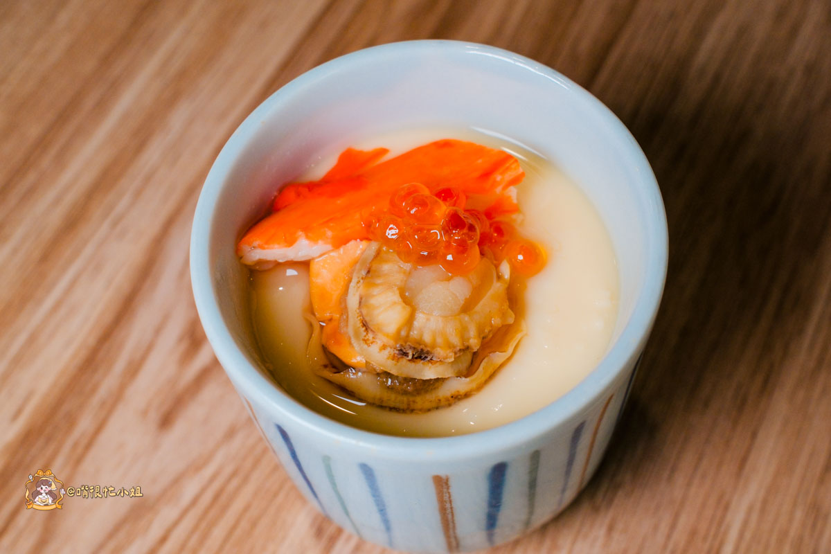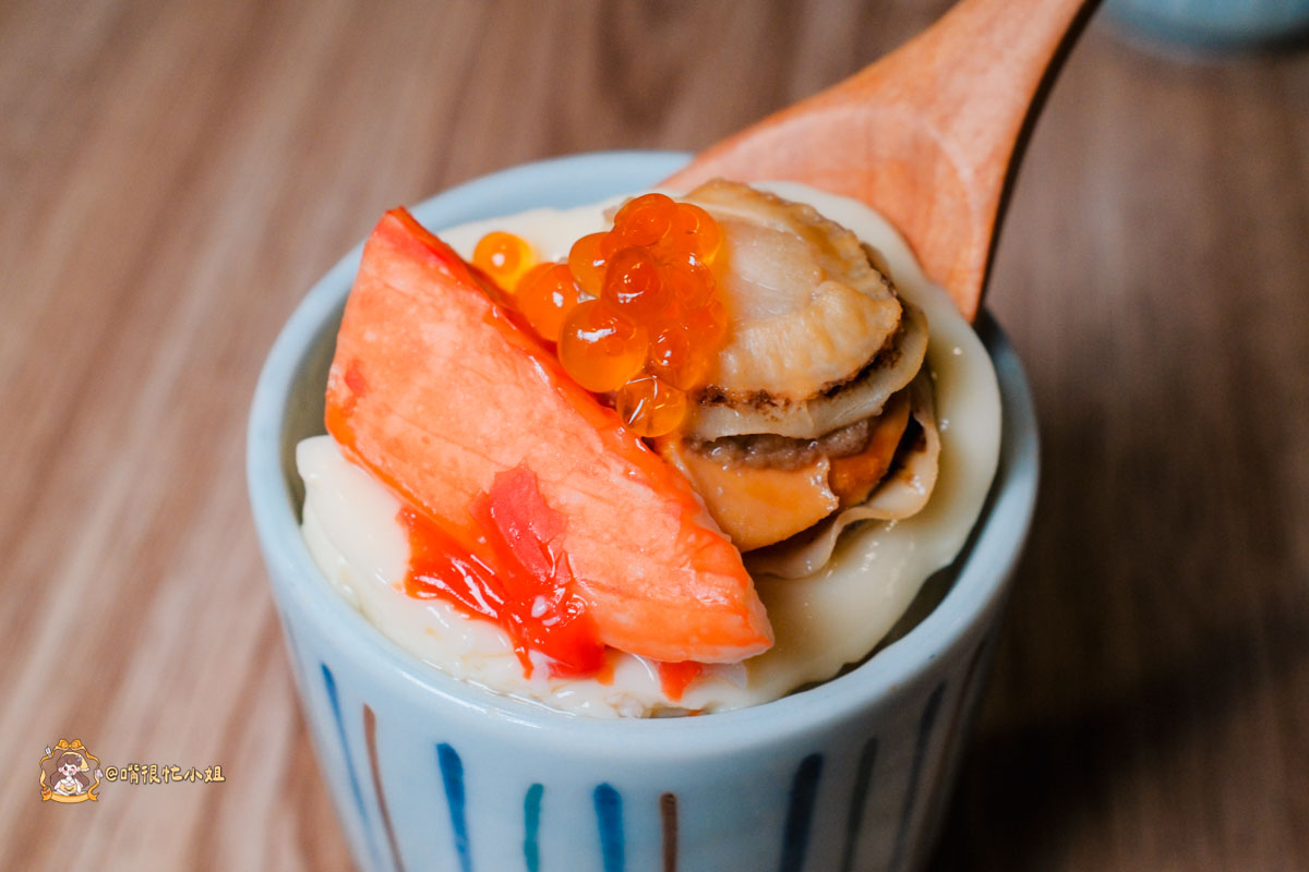 茶碗蒸滑順綿密,湯汁清透,裡面還藏著干貝與蟹肉棒;上層撒上鮭魚卵,微鹹爆汁的口感讓整體更有層次。