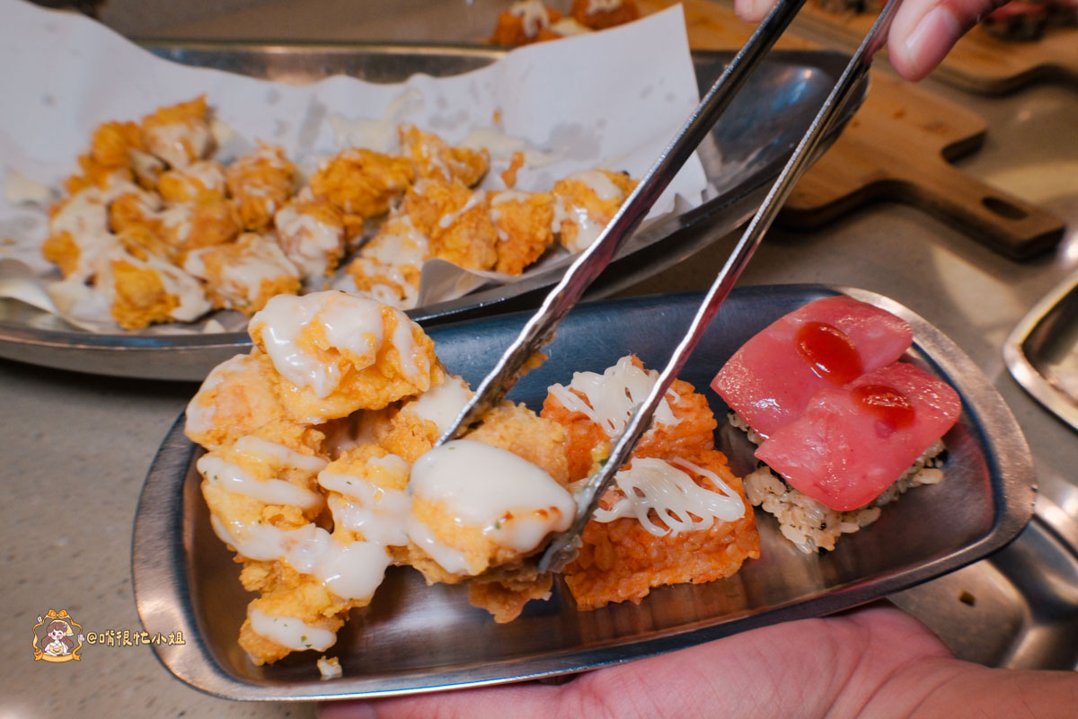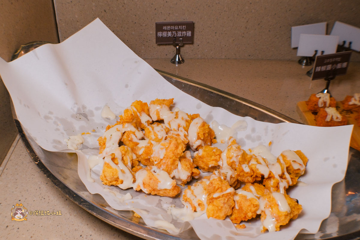 炸物控的天堂在這裡。甜不辣、海苔捲、炸餃子、炸雞全都有,韓式小壽司每款也都看了直流口水,尤其燈光照得金黃酥亮,每樣都香氣逼人。