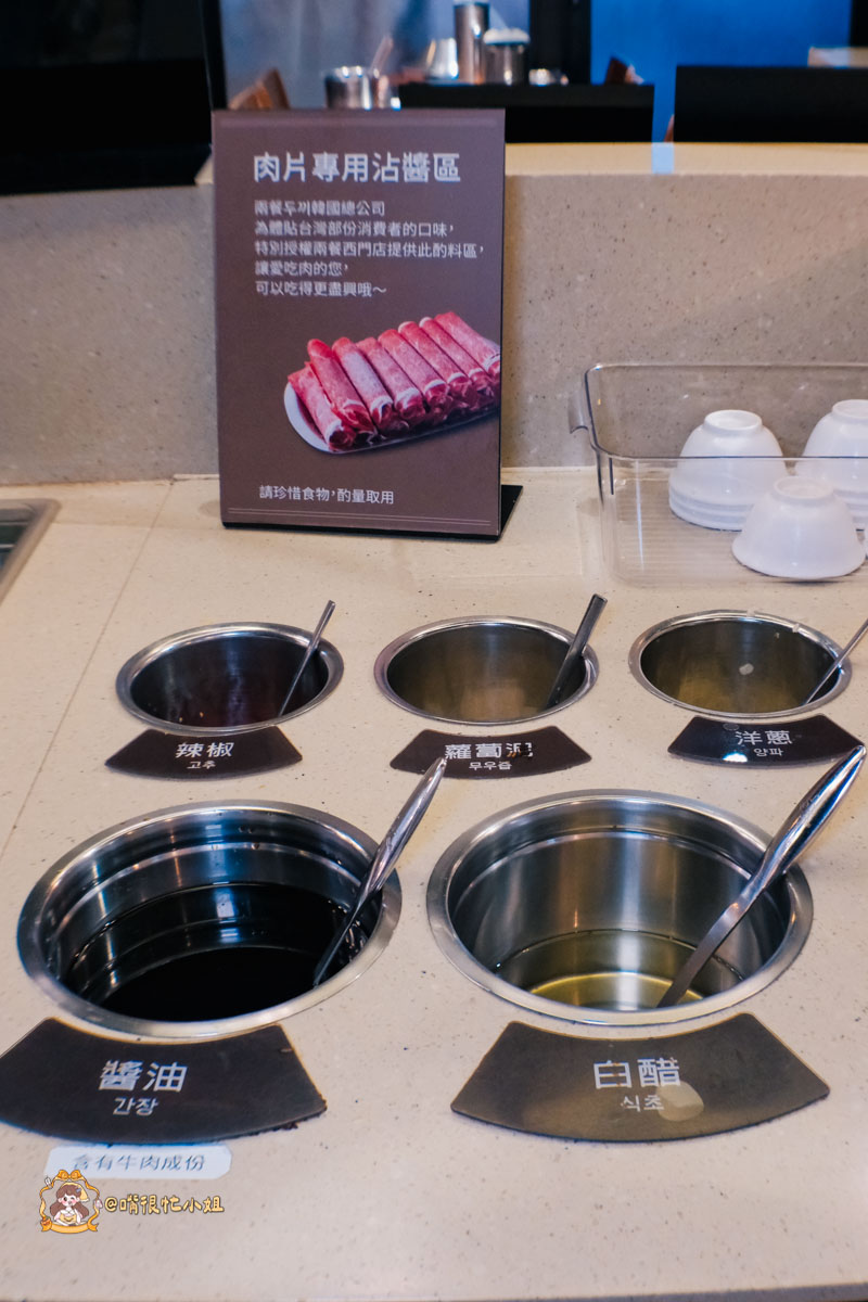 湯底是兩餐的靈魂;辣醬、糖、水、蒜末都能自己調比例,我喜歡加一點火雞麵辣醬那種偏粉紅的色澤。除此之外也有沾肉片的醬料區。