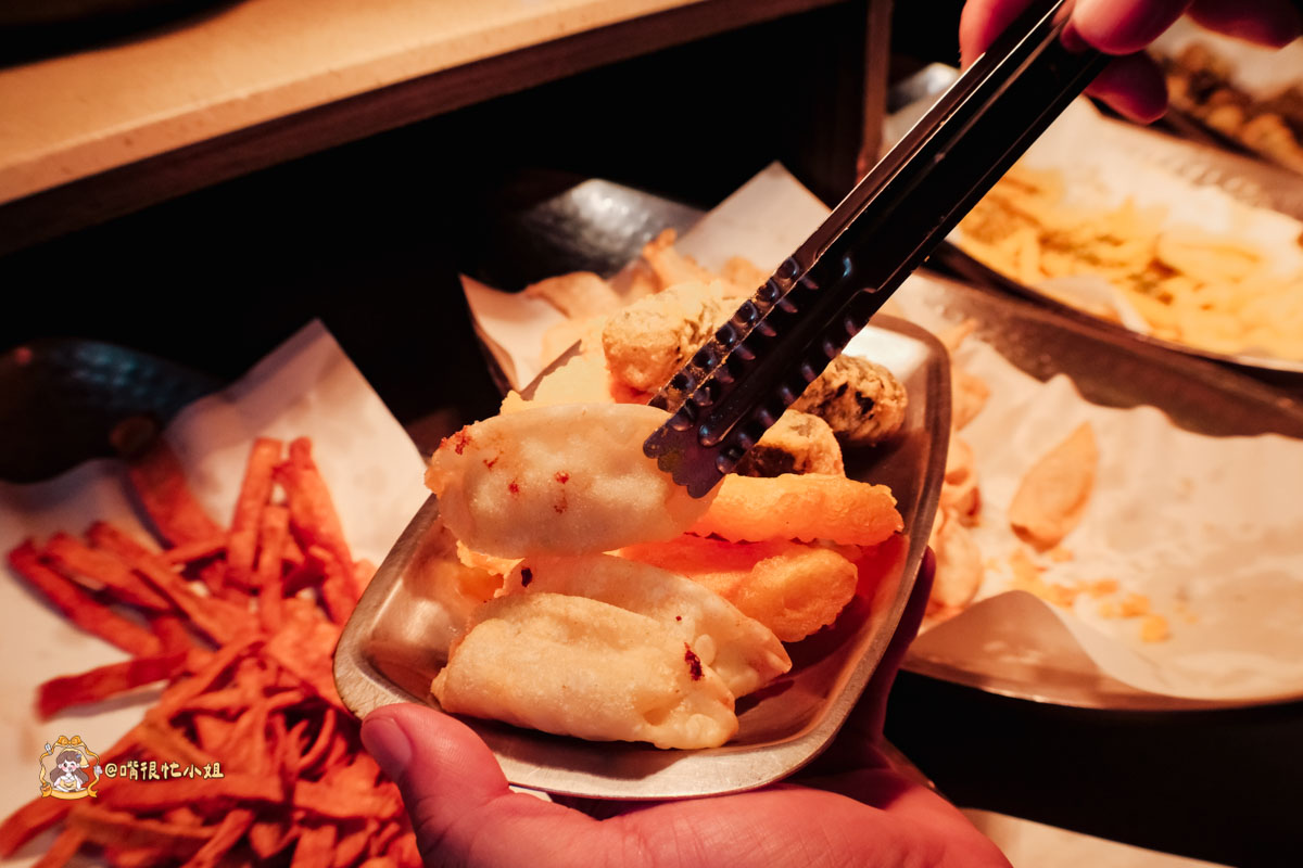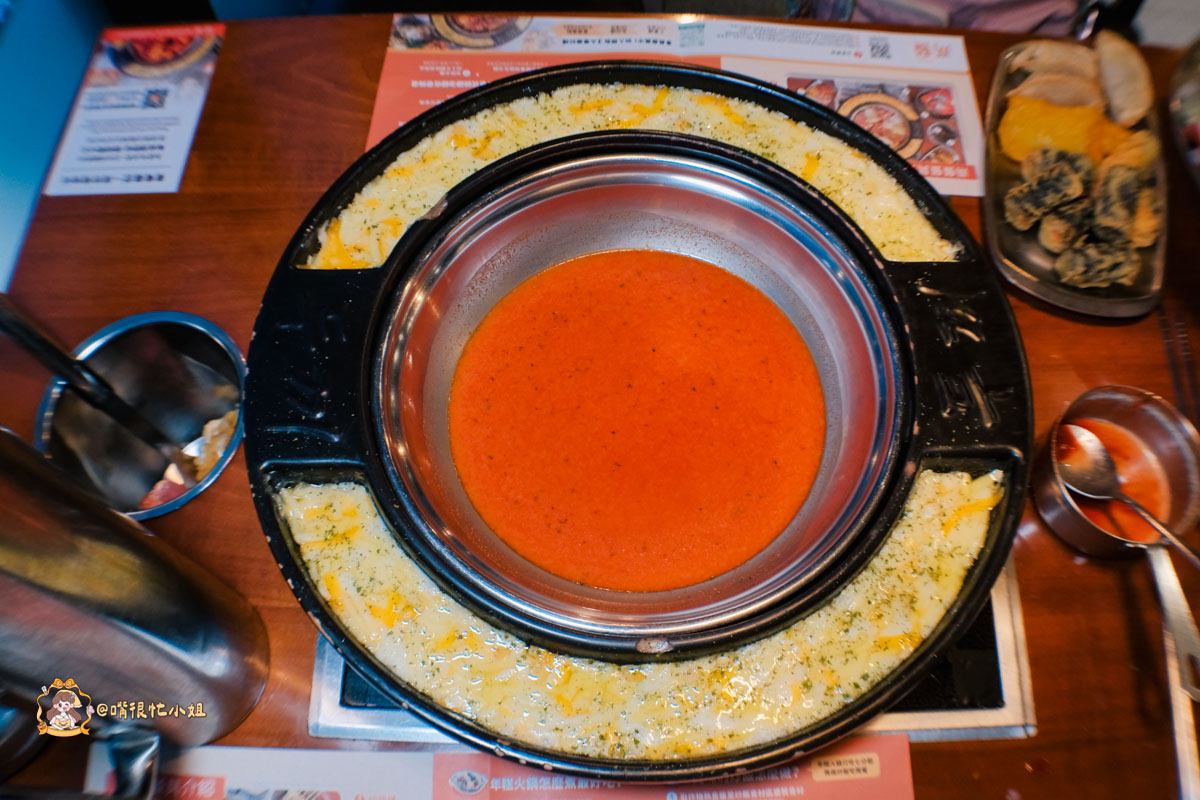 湯底我們照著教學調了類似火雞麵的辣醬風味,不過主角是這道雙色起司圈,如果你是起司控,這個升級一定要加。外圈鋪滿黃白起司絲,隨著火鍋加熱慢慢融化,邊緣還會微微焦脆。拿炸物、年糕、肉片、甚至飯糰去沾都超搭。