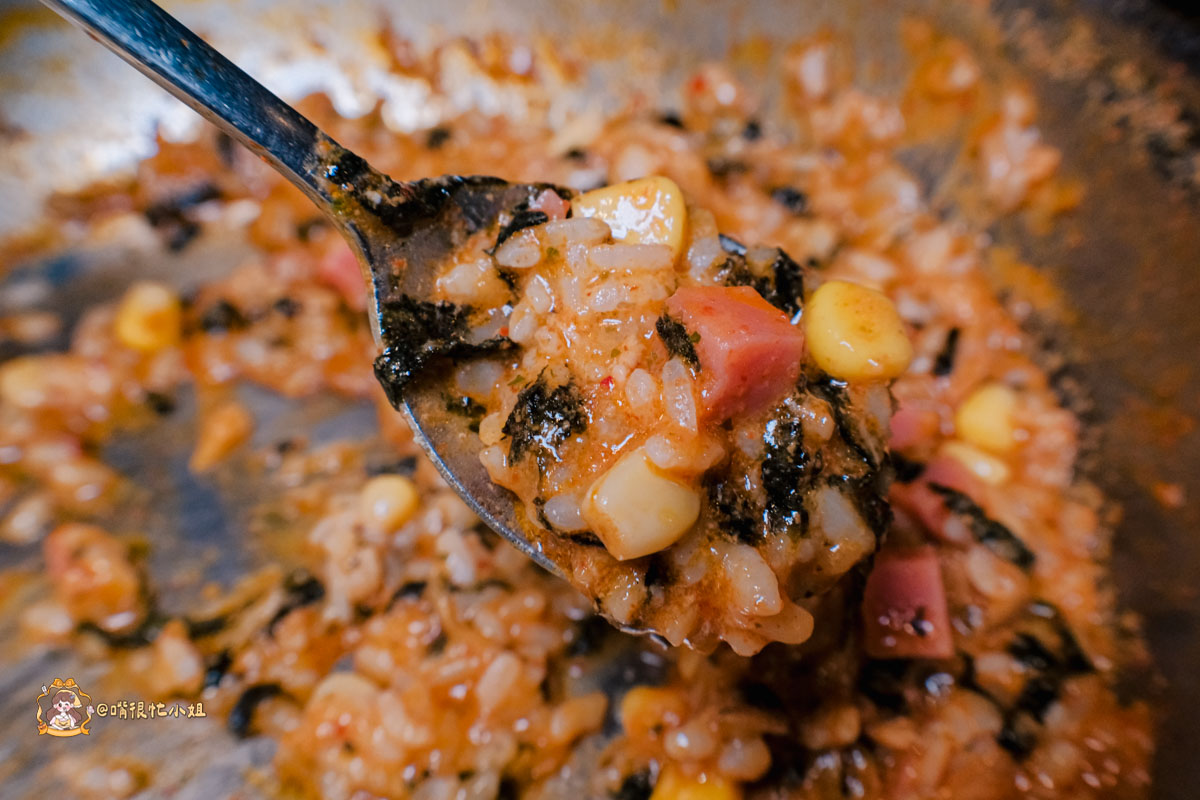最後的壓軸是「收湯炒飯」。把剩下湯底與飯、玉米粒、海苔、泡菜混在一起,拌炒到湯汁略收乾。我沒有炒得太乾,吃起來像濕潤版韓式燉飯,辣香中帶一點甜,忍不住一口接一口。