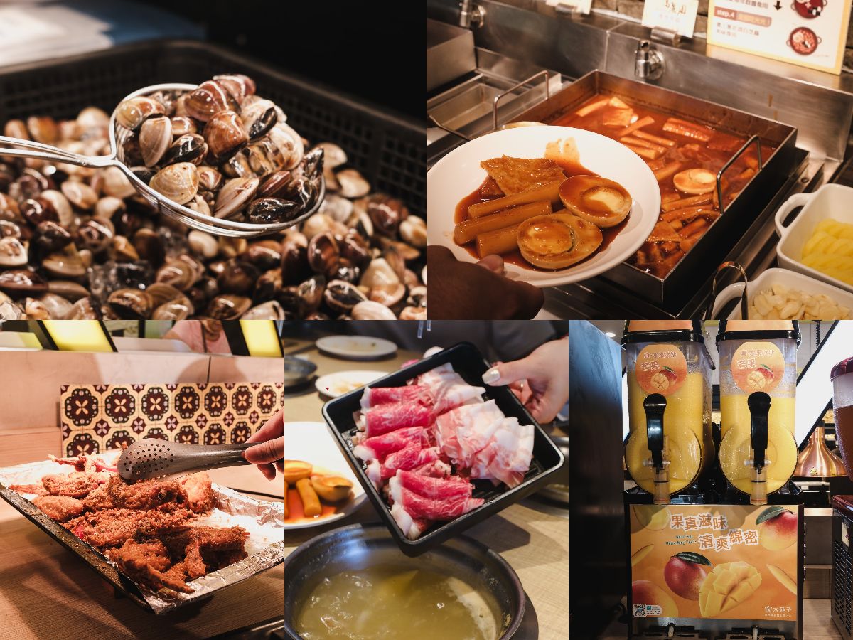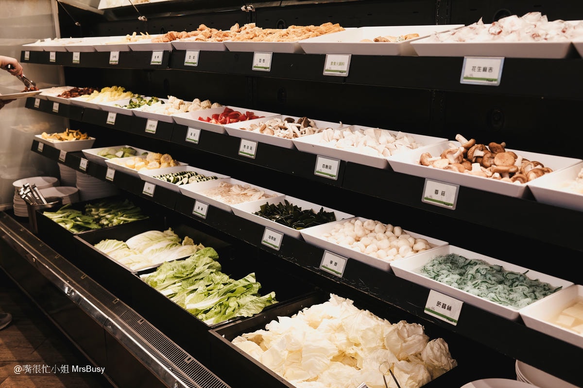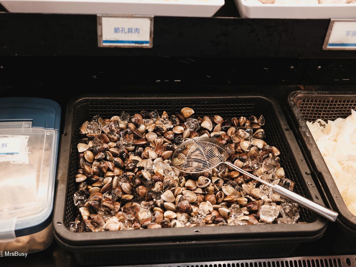 蔬菜與火鍋料超級齊全!一整面牆全是各式時蔬與菇類,另一面牆則是滿滿火鍋料與蛤蜊、蝦子、小章魚等可無限取用,海鮮控會很愛!其中蛤蜊很新鮮大顆,補得也快,感覺吃個兩大杓就可以回本XD