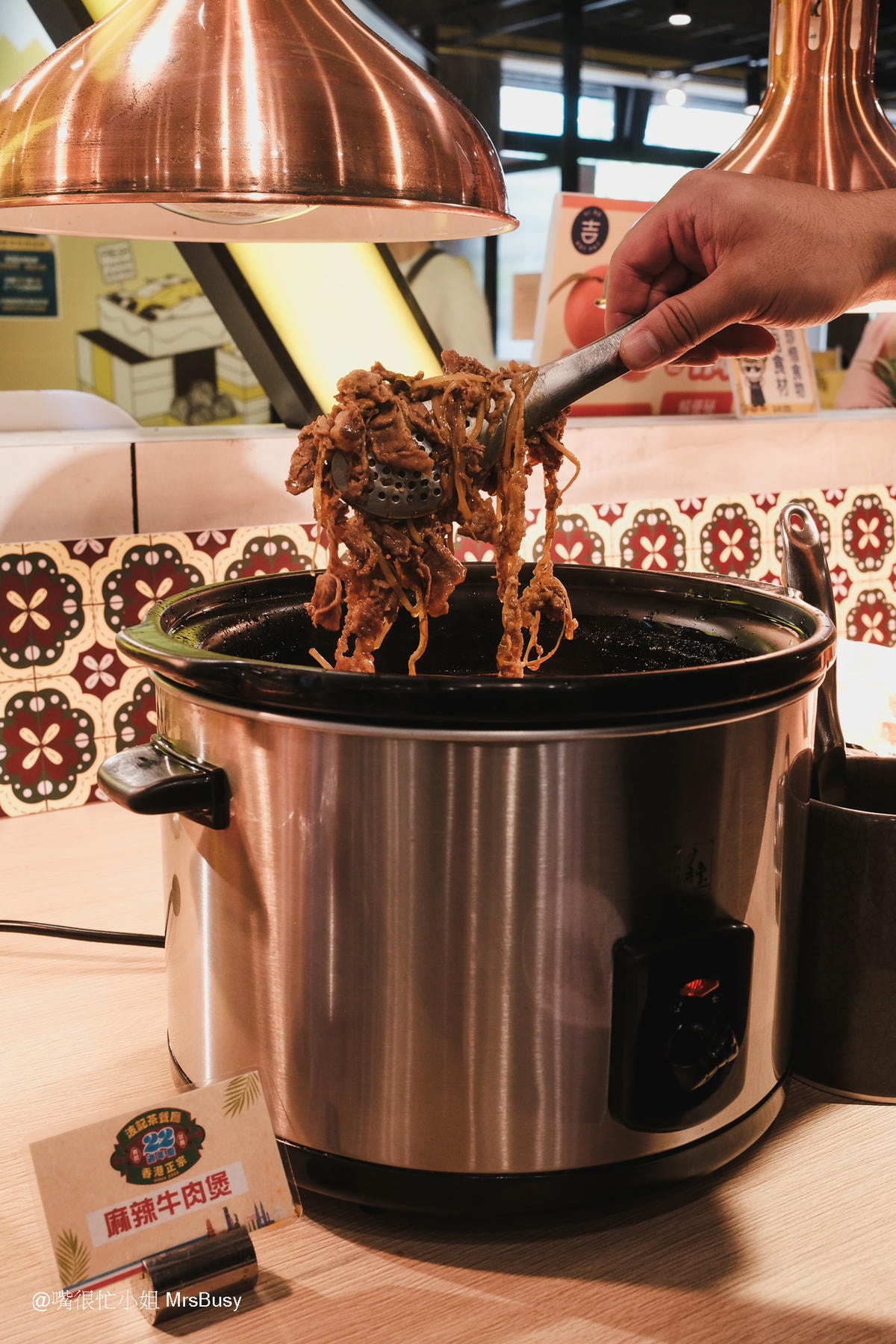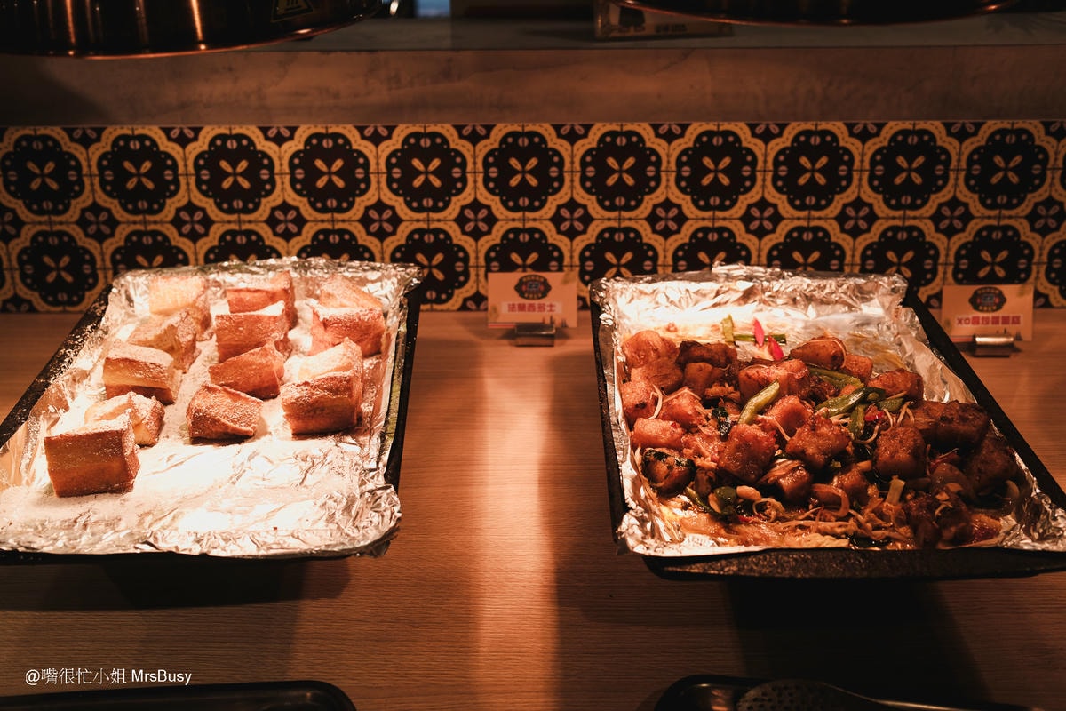 聯名的波記茶餐廳則是有:麻辣牛肉煲、XO醬蘿蔔糕、西多式;麻辣牛肉煲算蠻重口味,肉片給得分量很夠,隨便一夾都是肉;西多式則是甜中帶脆,港味十足!旁邊還有一小區台式小吃,是炸雞翅跟臭豆腐,這些東西竟然可以在火鍋店吃到,真的超特別。