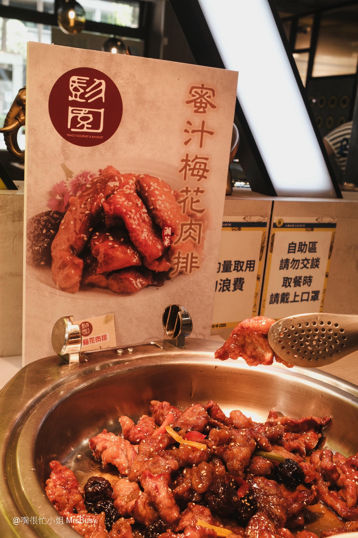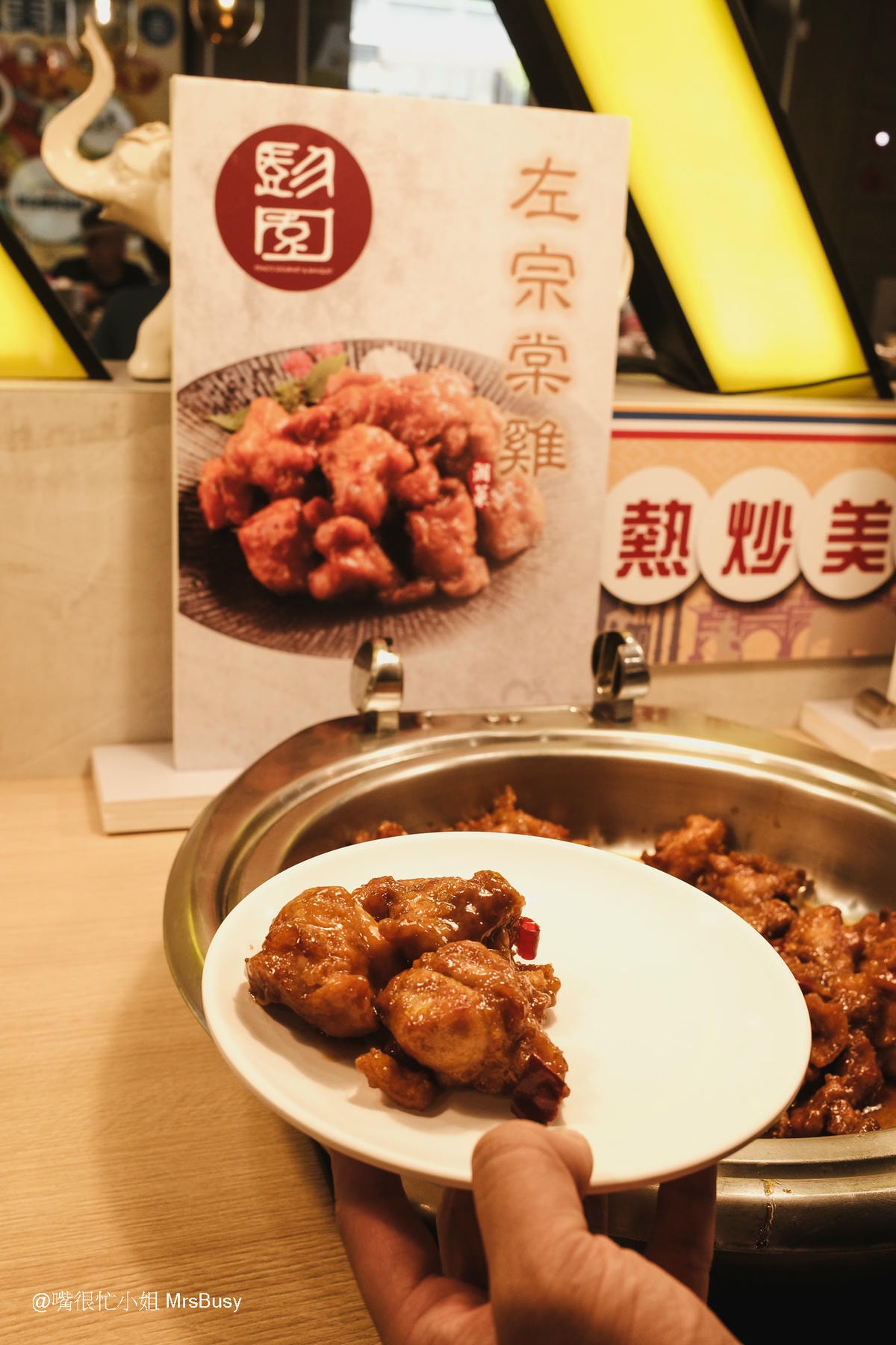 也吃得到彭園的左宗棠雞、蜜汁梅花肉排;左宗棠雞炸得外酥內嫩、醬汁微甜帶,蜜汁梅花肉排則是肉質厚實、甜鹹入味,咬下去彈性十足;這兩款也都超下飯!