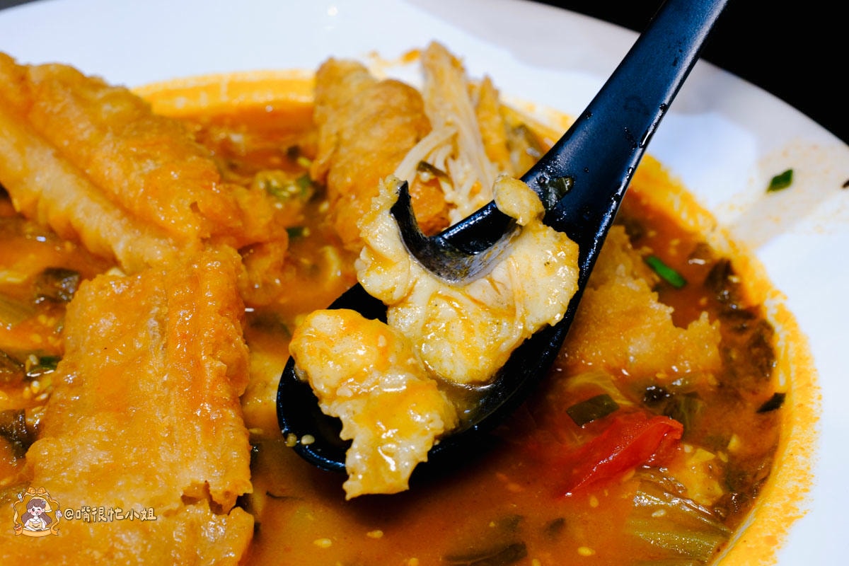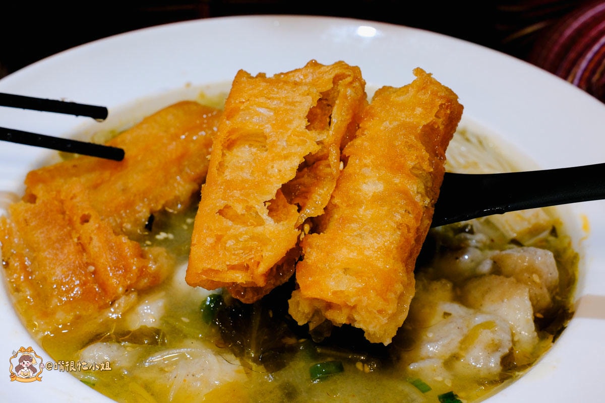 湯底是用金瓜與黃燈龍椒熬製,酸味厚實卻不嗆喉,帶有自然甘甜。魚片鮮嫩,搭配泡到剛好的酸菜,整體酸辣中帶一點甘醇,再舀一匙淋在白飯上,搭配吸飽湯汁的油條,直接秒殺一碗飯。