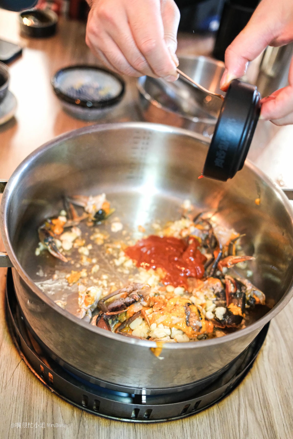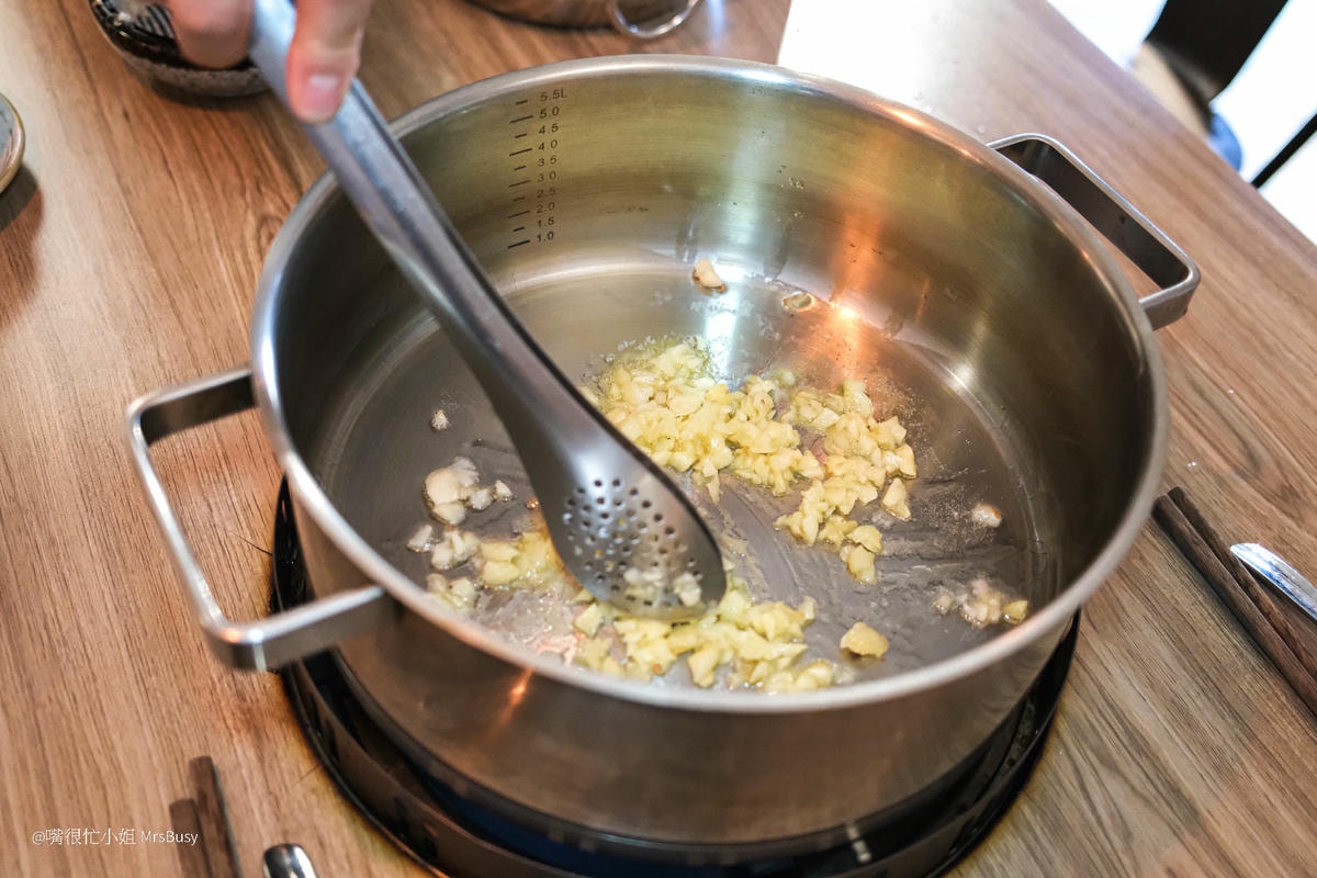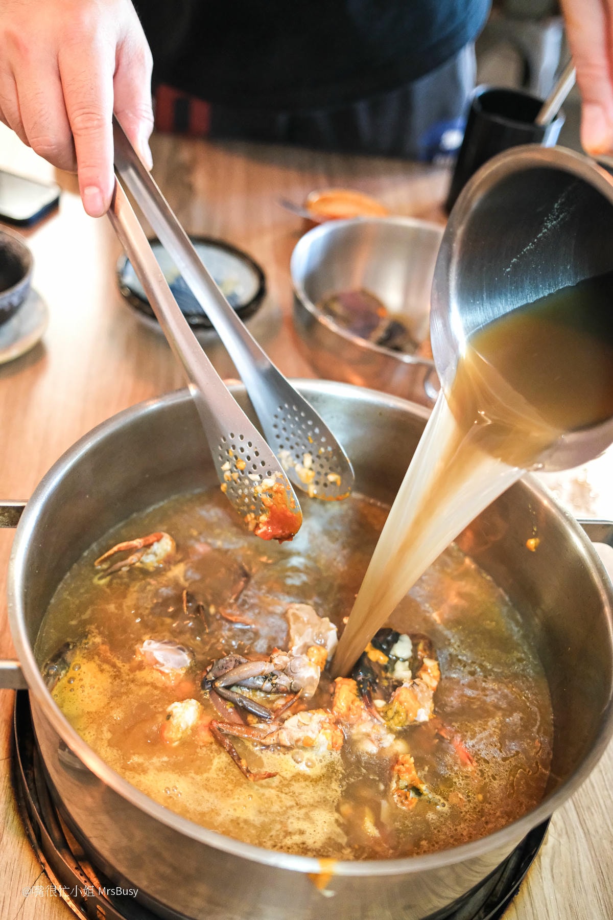 極蜆鍋物的招牌湯底,會先用奶油將蒜頭爆香,加入當季鮮蟹以及蟹膏爆炒,倒入獨門秘醬後再加進龍蝦頭熬煮的高湯,湯頭層次鮮甜無腥味,喝起來滑順且帶有一點點胡椒的辣度,非常好喝。