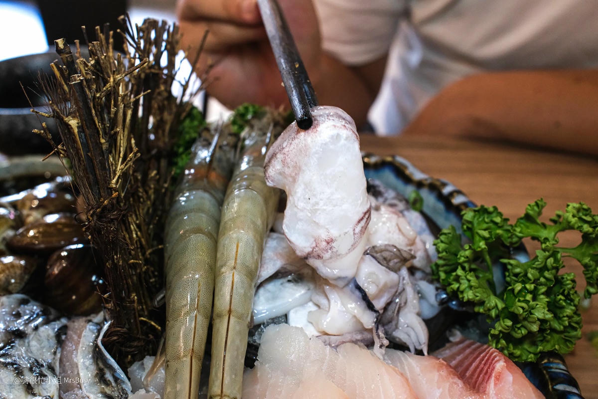 想吃豪華一點就點雙人海鮮拼盤!內容有:蛤蜊、蝦子、鯛魚、鱸魚、軟絲,擺滿一大盤,真的適合大口吃海鮮,非常過癮。