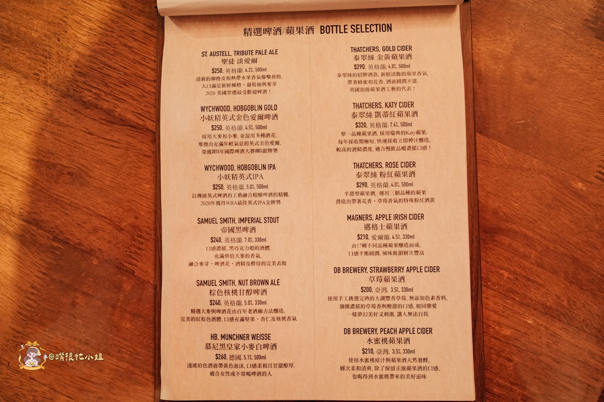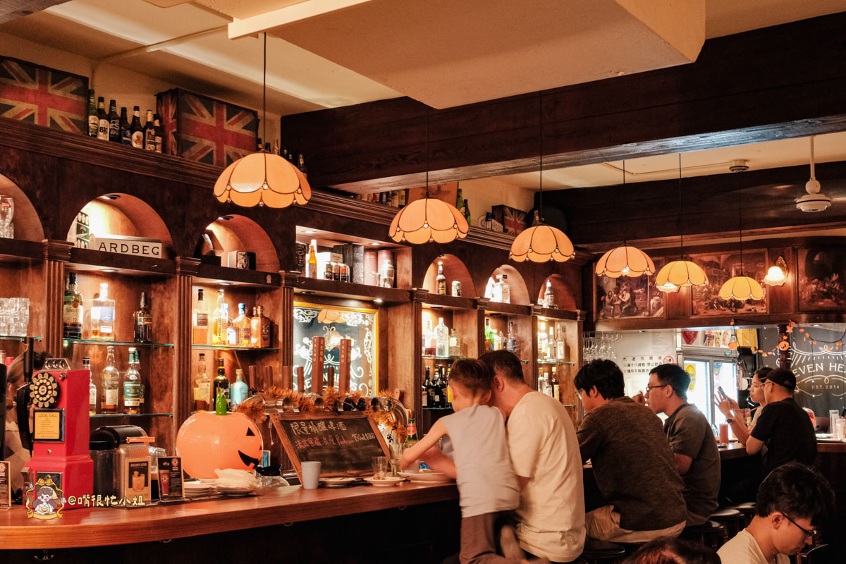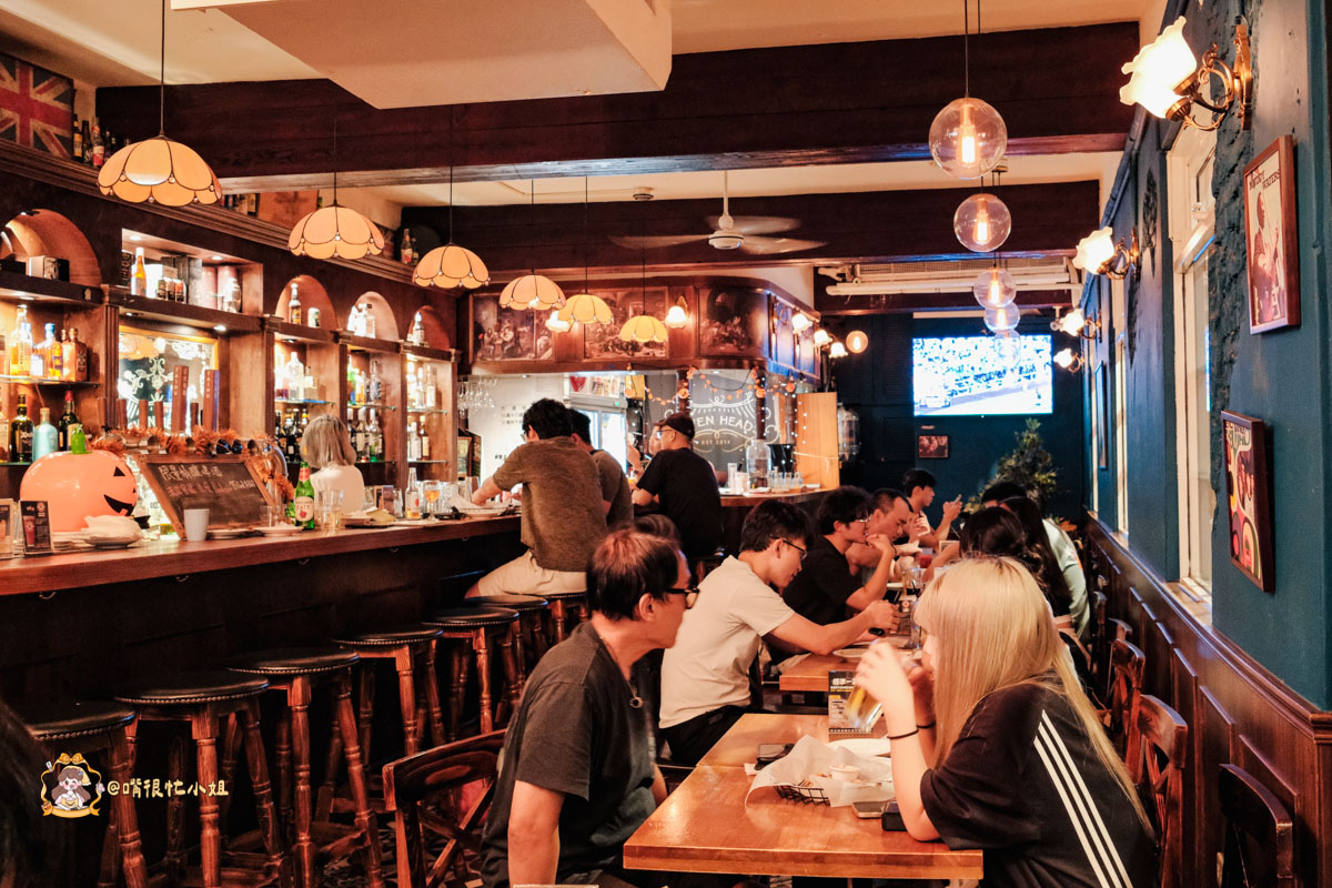 店內氣氛極好。暖黃燈光照著深色木桌,牆上是老照片與英國街景掛畫,吧台後方整排酒瓶在燈光下閃閃發亮。