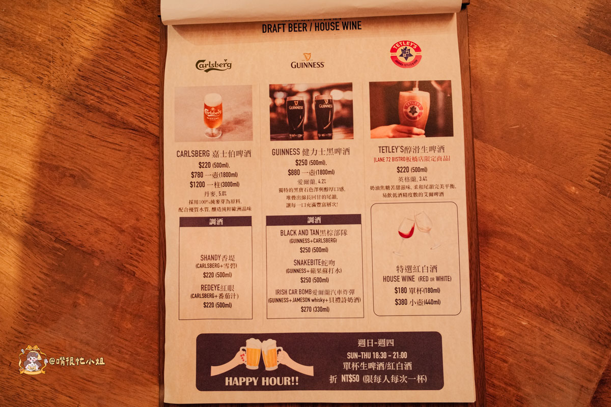 Lane 72 主打英式經典料理,從炸魚薯條、焗飯、淡菜,到英國進口生啤與創意調酒,餐點份量實在、價格合理,不收服務費、不限時,是那種能坐下慢慢喝的餐酒館。