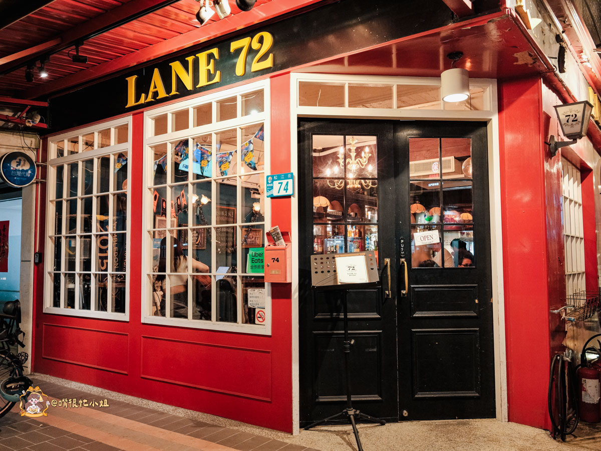 紅色外牆配上黑色雙開門,一眼就能認出這家 LANE 72 Bistro。黑底金字的招牌帶點歐洲酒館氣勢,大片玻璃窗透出暖黃色燈光,裡頭傳來聊天聲、酒杯碰撞聲,氣氛很熱鬧。週六日限定的英式早午餐則主要提供英式早餐、咖啡與輕食,下次有機會再來嘗鮮。