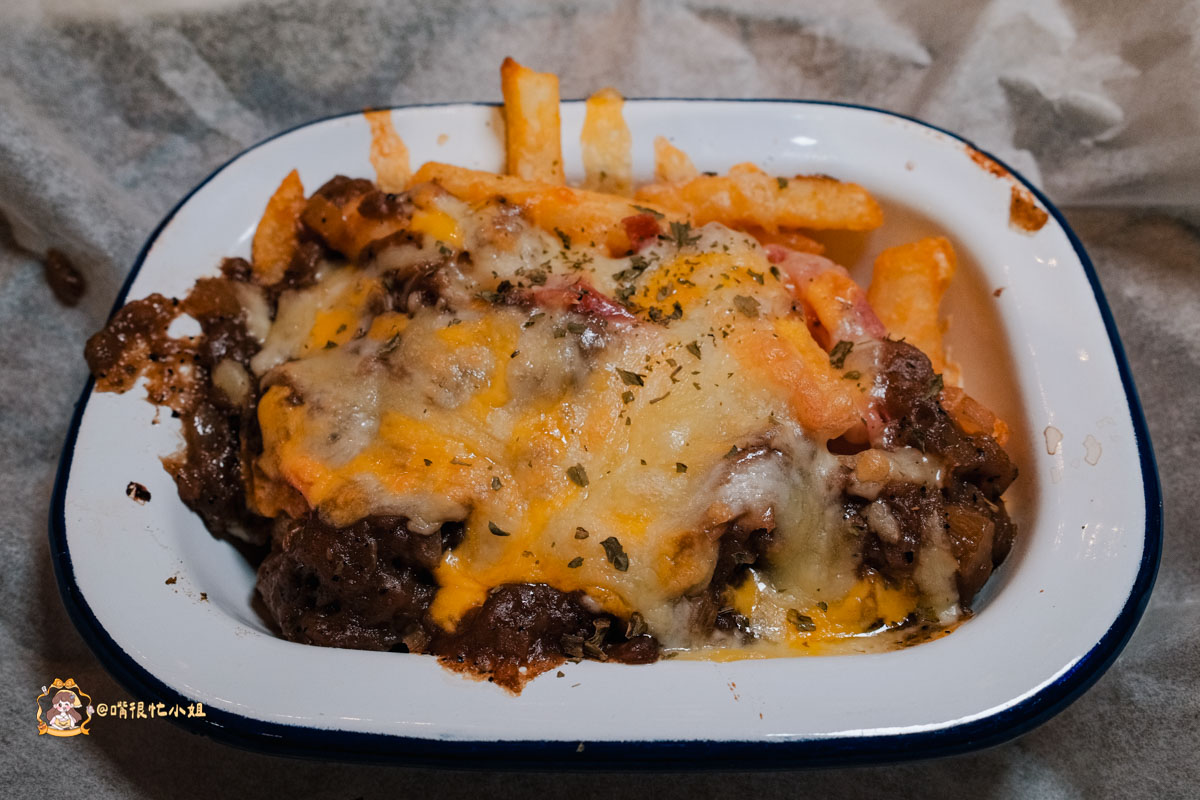 炸薯條拌入熱騰騰洋蔥肉醬,鹹香濃厚。洋蔥炒得軟透、甜味被逼出來,搭上肉醬鹹中帶點微辣,一不小心就會吃光光。