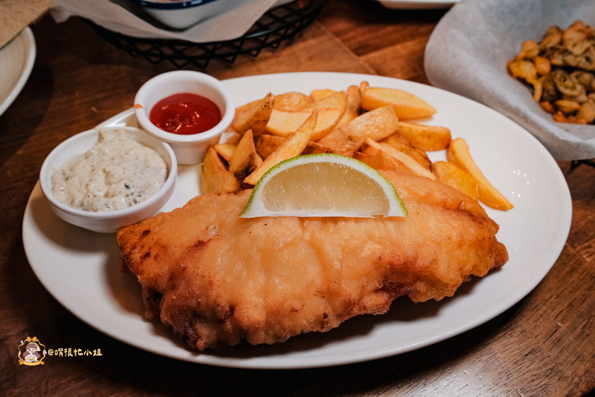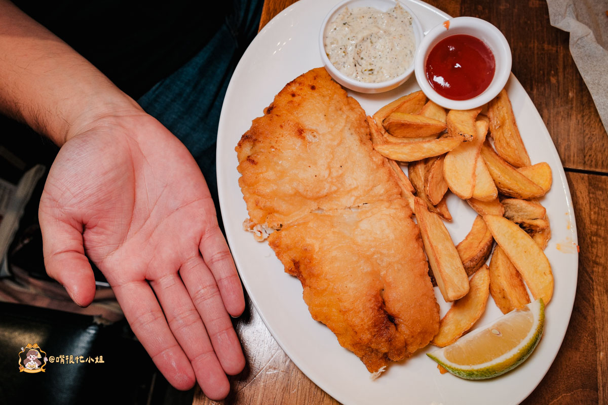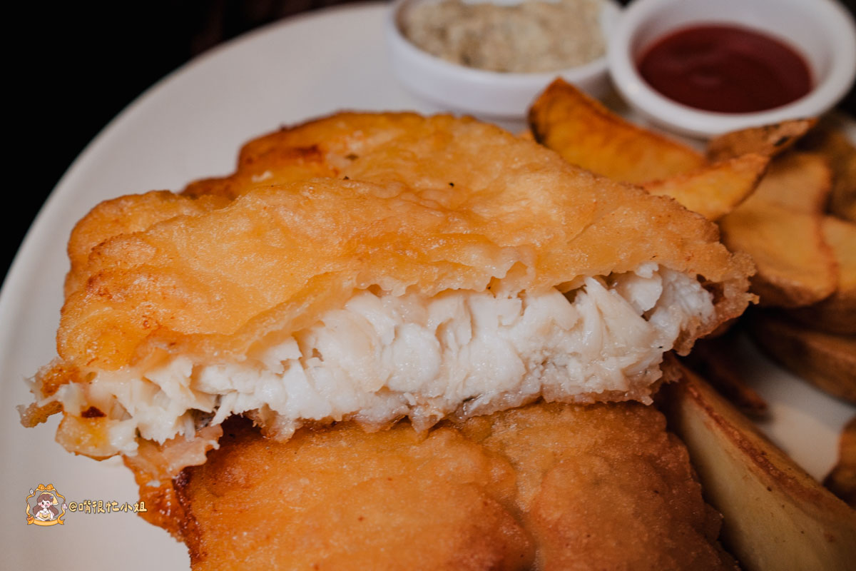 比手大的魚排炸得金黃酥脆,外層很薄脆,裡面魚肉細嫩、帶著微微油香。搭配厚切帶皮薯條,外脆內鬆,沾塔塔醬酸香平衡,吃起來很涮嘴。