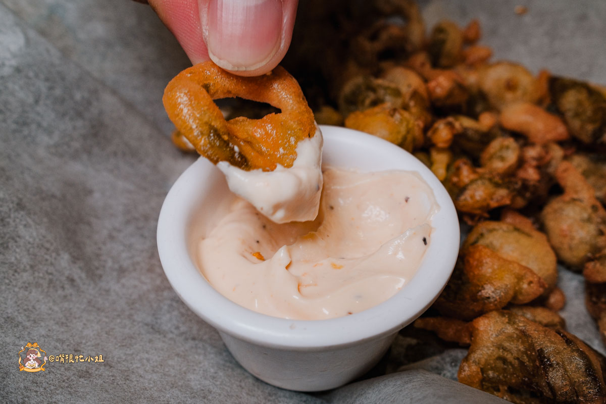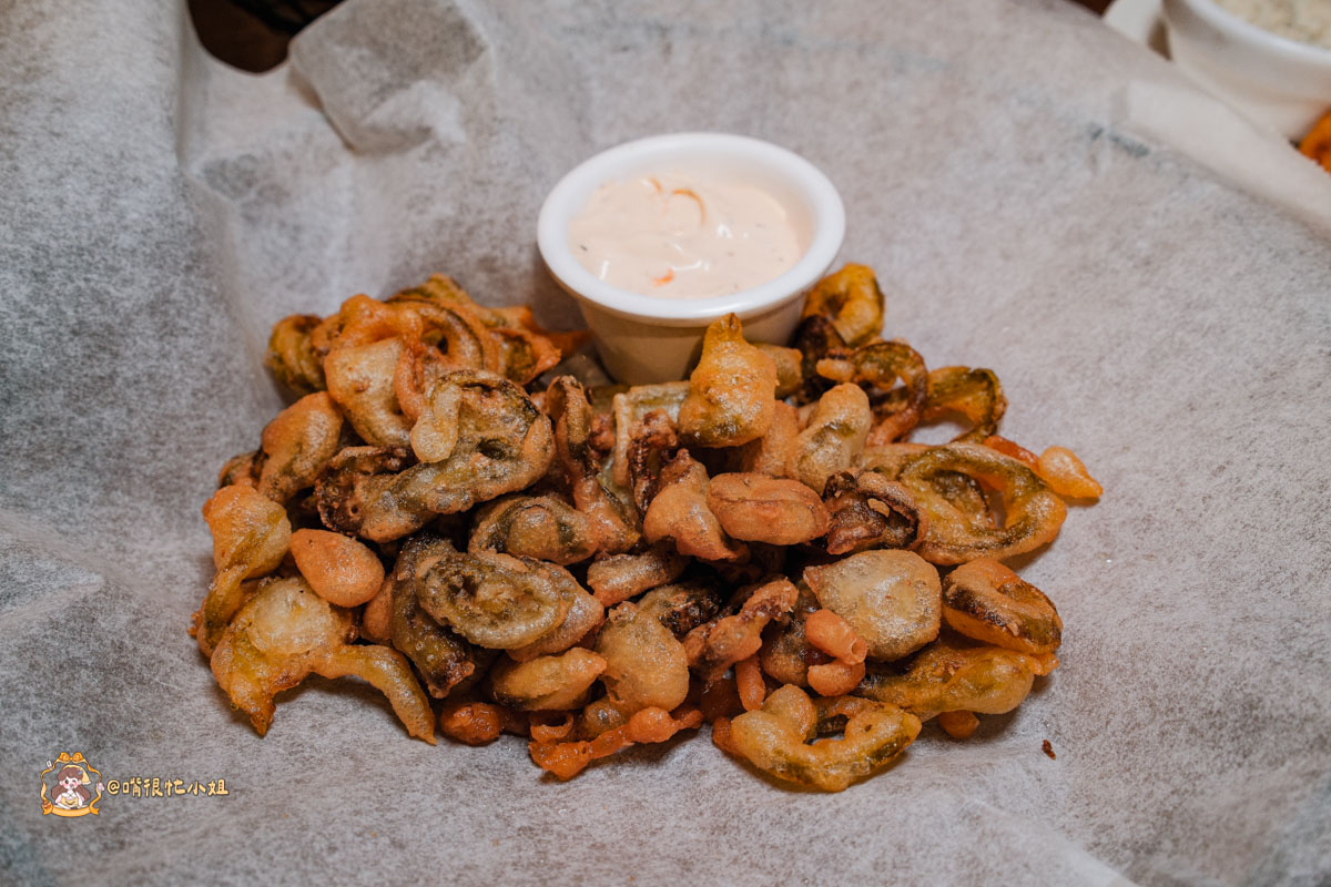 墨西哥辣椒切成厚圈後裹粉炸得金黃,外皮喀一聲脆響、裡頭保留微辣的椒香。趁熱沾上店家特調奶油醬,辣與奶香交錯得剛剛好;口辣、一口啤酒,爽度直接拉滿,是超人氣的下酒菜。