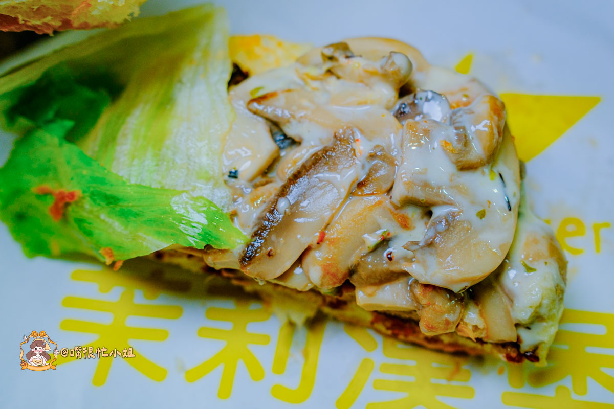 這款吃起來沒有那麼罪惡,蘑菇經過炒香後帶點甜味,混著肉汁一起滲進麵包。熱氣裡夾著蘑菇香與奶香,讓整體味道更細膩,口感濕潤又滑順。