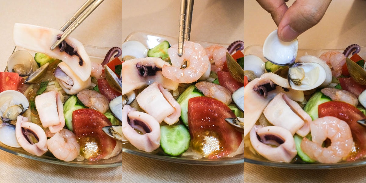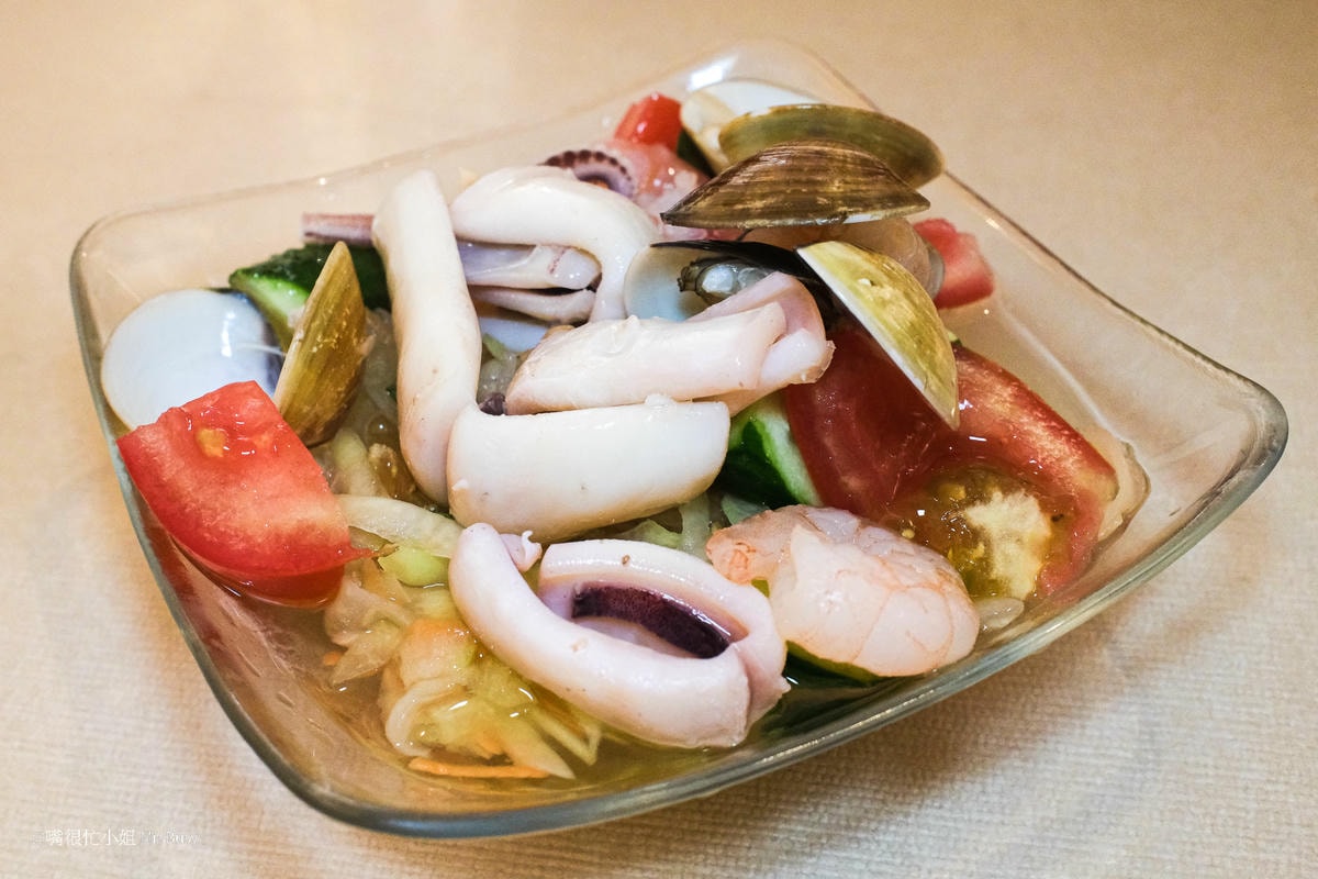 海鮮沙拉的配料很豐富,有蝦仁、花枝、蛤蜊,三種食材都很新鮮,搭配酸甜的醬汁和生菜、青木瓜絲,一口接一口完全停不下來,特別適合夏天當開胃菜。