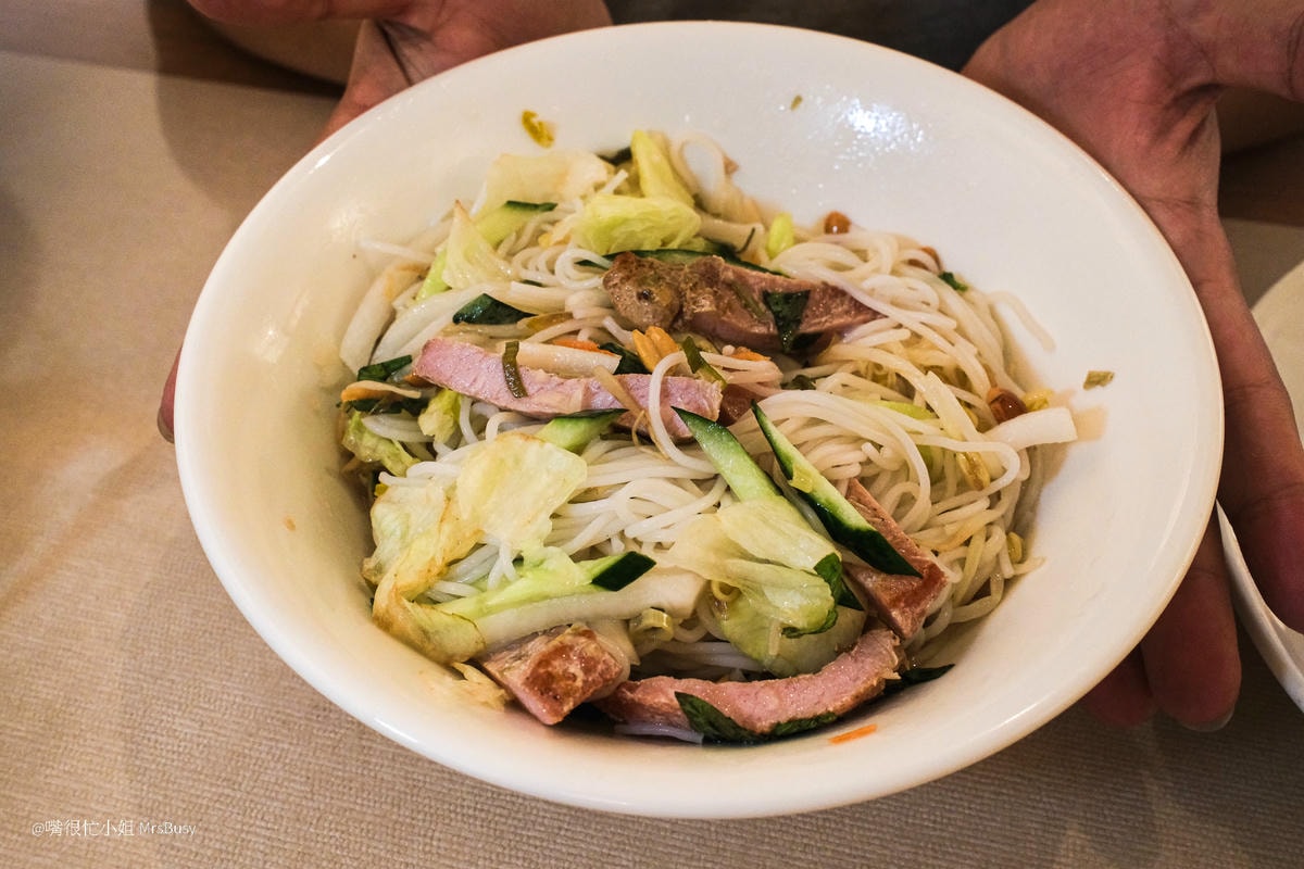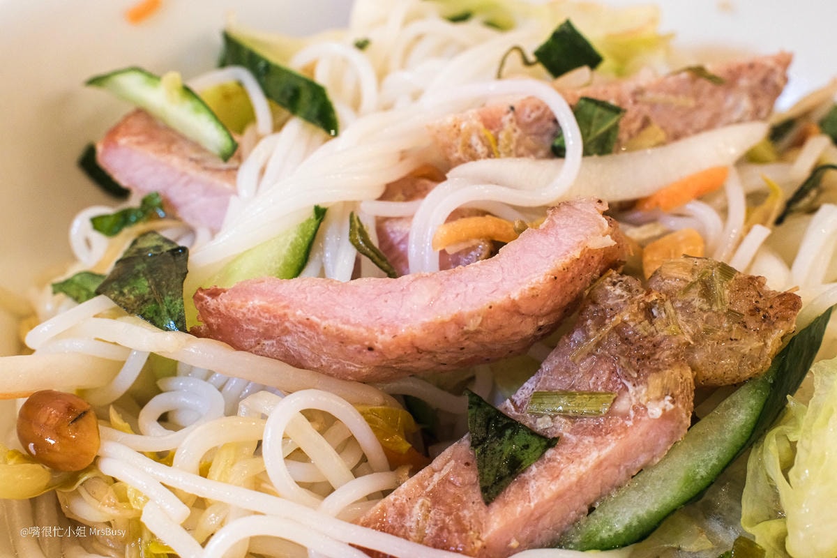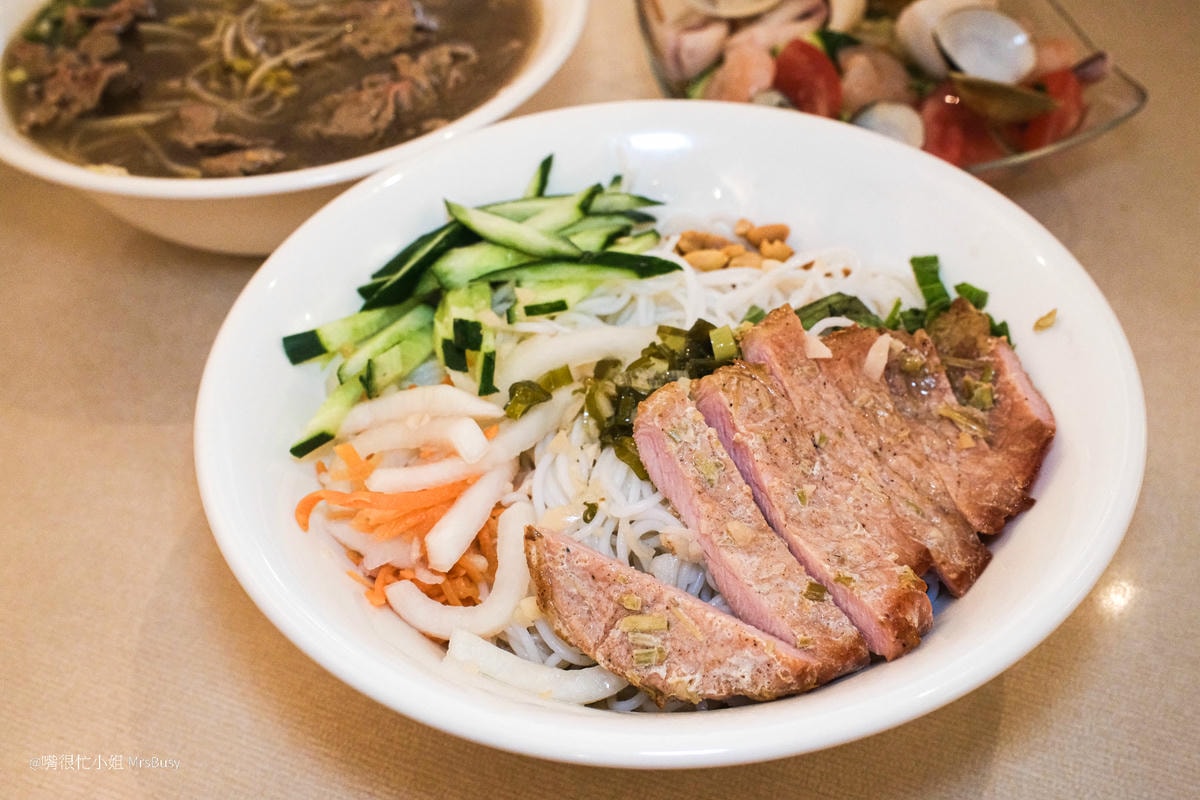 吃越式必點米線!這道米線的排骨帶著香茅的香氣,很好吃,涼拌米線搭配微酸微甜的魚露醬汁與小黃瓜、青木瓜、花生米,拌一拌後吃起來超清爽,很適合最近炎熱的天氣。