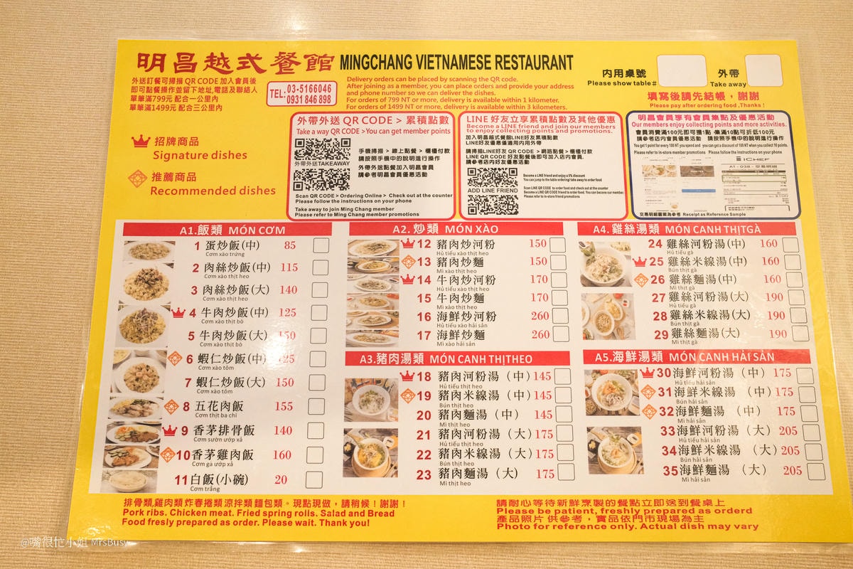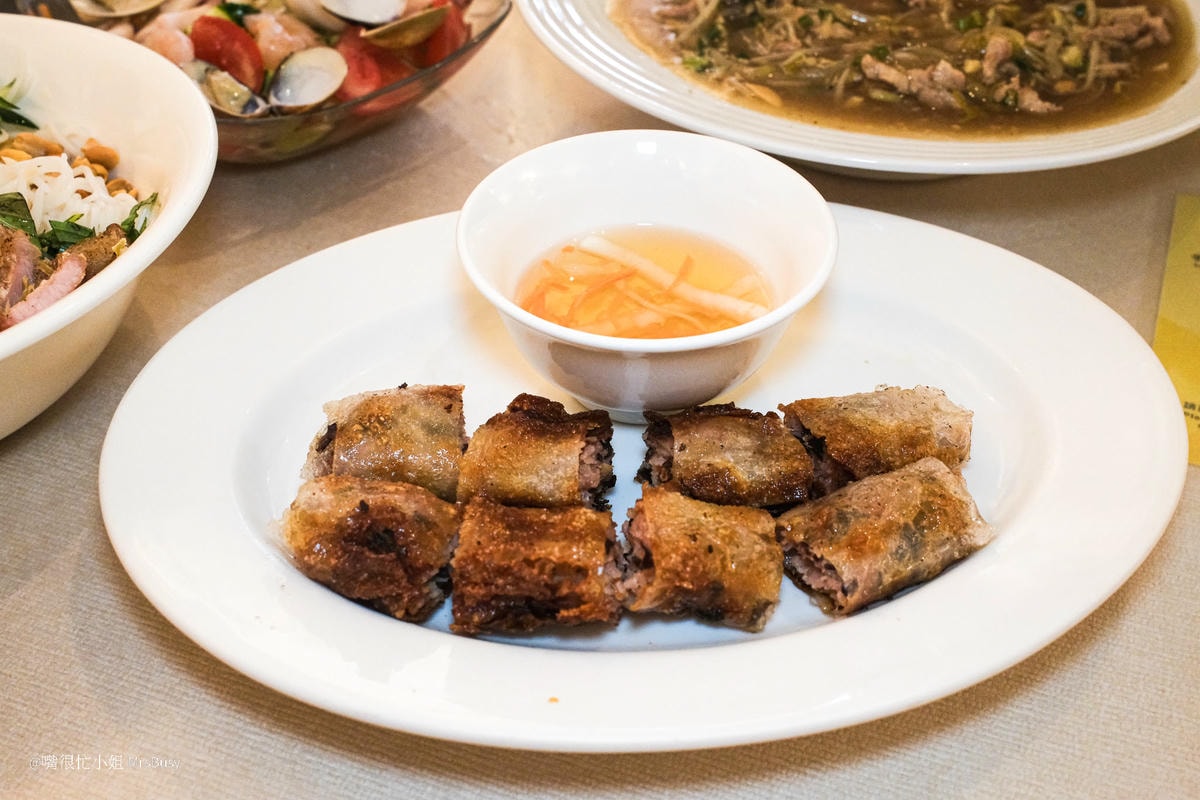 價位親民,大多落在 100~220 元之間,以新竹物價來說算是中規中矩。菜單品項選擇多,大部分想得到的越式料理這邊都吃得到,有河粉、米線、炸春捲、涼拌小菜、法國麵包,身為腦袋比嘴巴還餓的嘴很忙小姐當然是全部都要來一份XD