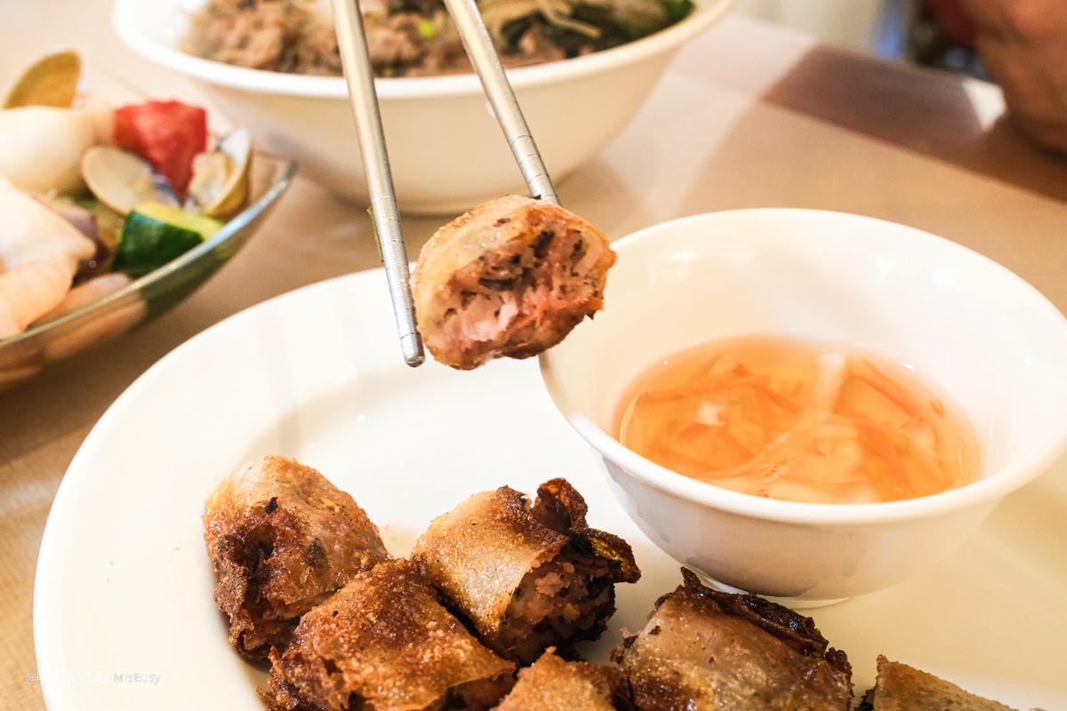 每次看到炸春捲都忍不住一定要加點XD明昌越式餐館的炸春捲外皮金黃香酥,內餡吃起來有一點點的紅麴味,友人說有一點像香腸的味道,單吃或沾魚露都很讚。是很受歡迎的招牌小菜。