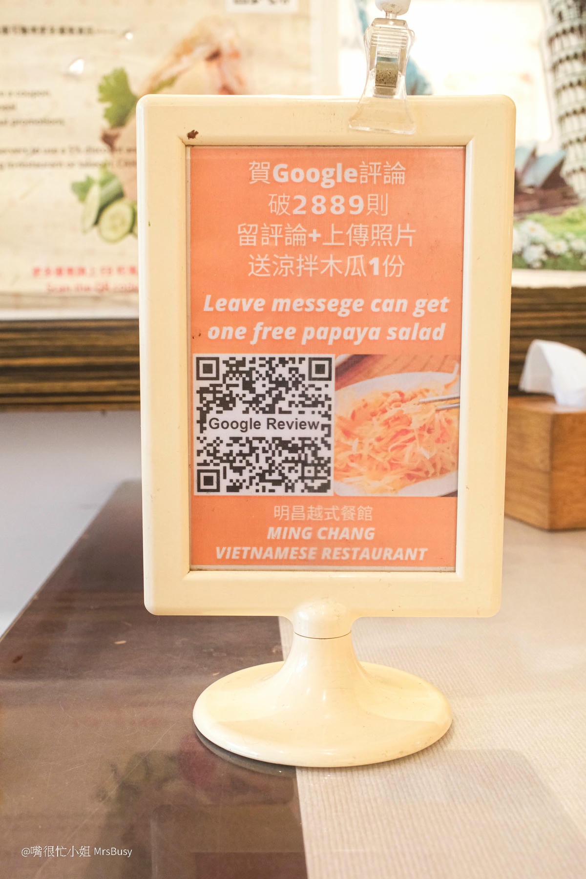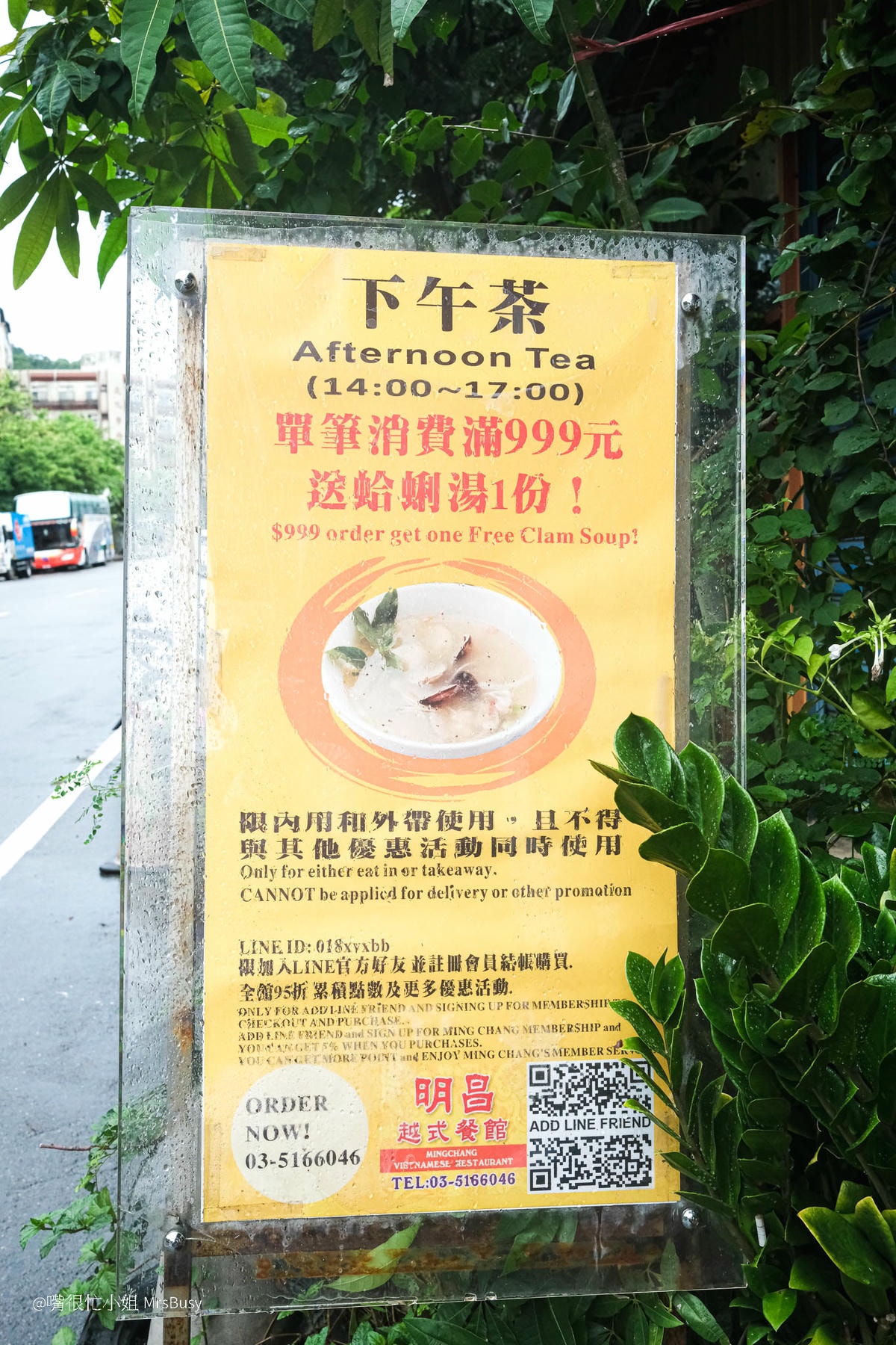 明昌越式餐館也都會不定期推出優惠活動,我們這次來是下午滿999送蛤蜊湯一份(價值$110)以及打卡送涼拌木瓜一份(價值$95),加入LINE官方還可以累積點數跟享用餐折扣!