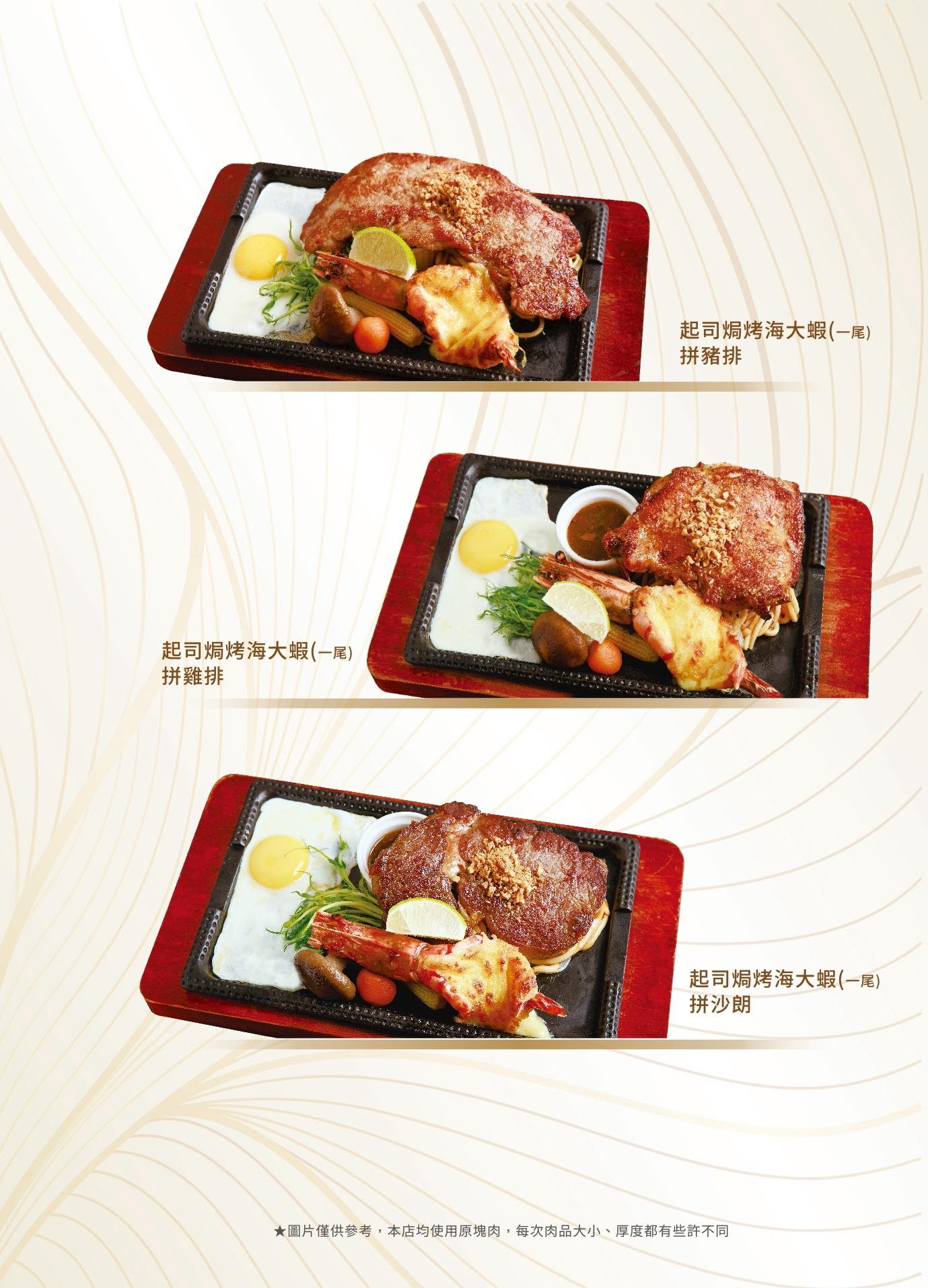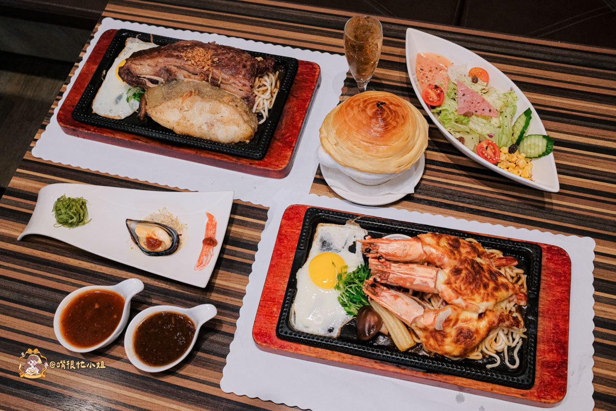 除了經典的牛排、雞排、豬排,也能加價變成「海陸雙拼」;餐點主打「豪華套餐」,只要點主餐,前菜、沙拉、濃湯、甜點、飲料通通包含在內。