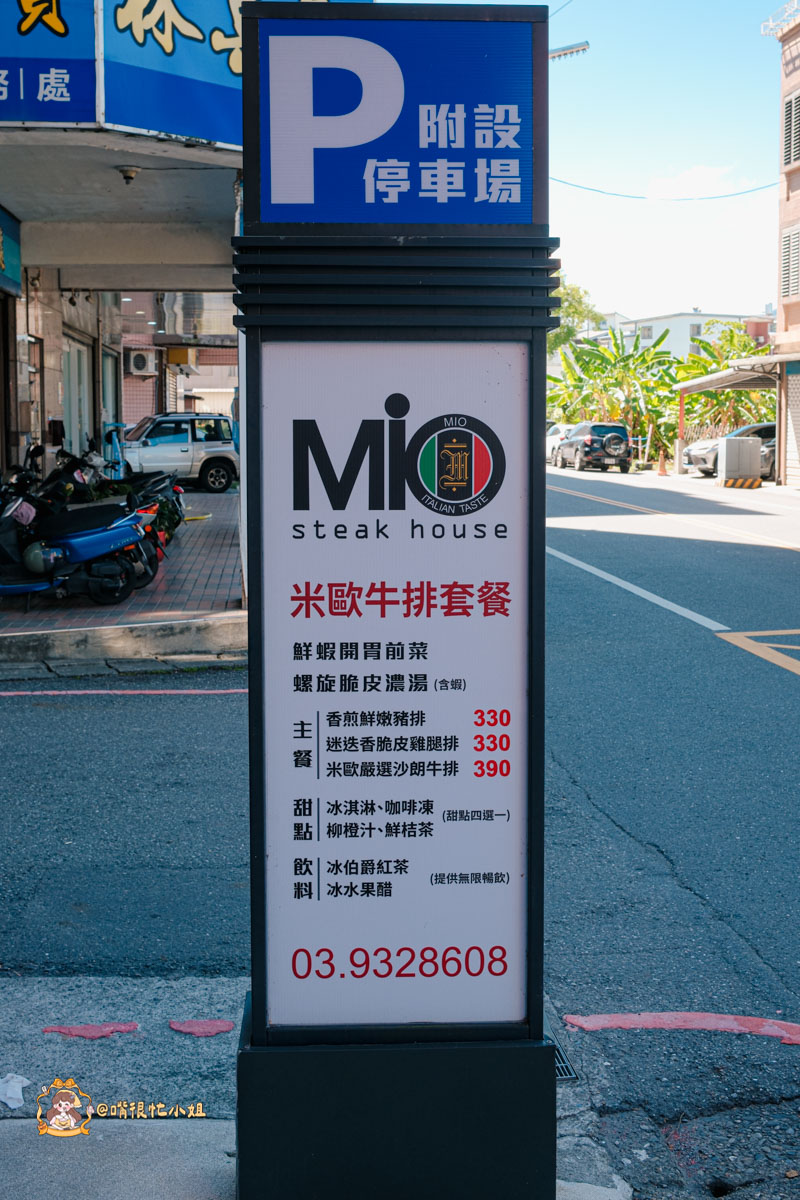 MIO米歐牛排館位在宜蘭市民族路上,紅色的招牌很醒目;一走進店內,空間非常明亮寬敞,整排落地窗讓陽光灑進來,桌距寬、沒有壓迫感。