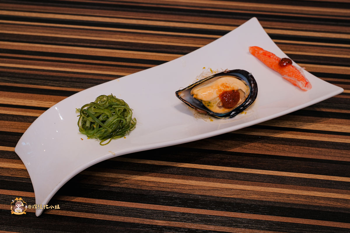 這道前菜擺盤漂亮又有層次。淡菜鮮嫩、沒有腥味,搭配海藻絲和蟹肉棒點綴,味道清爽不油膩。