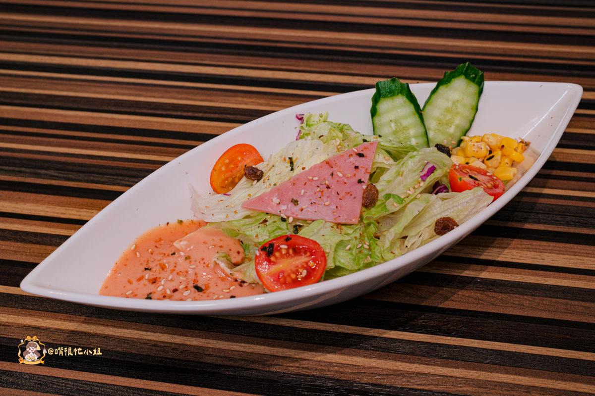 沙拉份量不小,生菜新鮮冰脆,搭配番茄、火腿、玉米粒與葡萄乾,酸甜平衡,而且上面還有白芝麻;千島醬的甜度剛好,不會蓋過蔬菜味,吃完滿口清香。