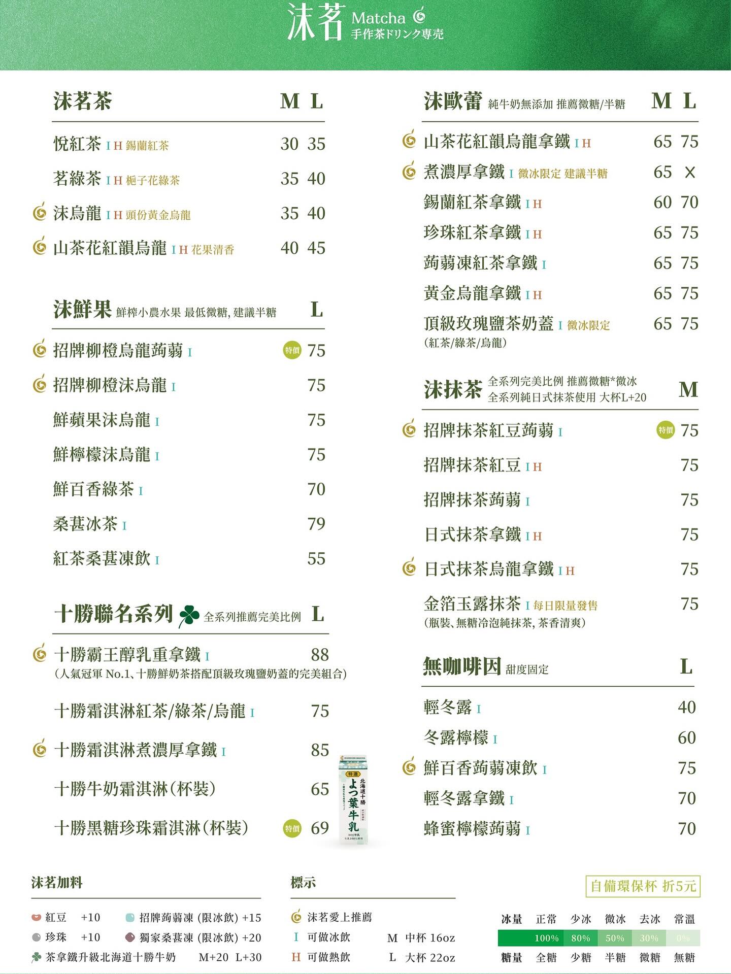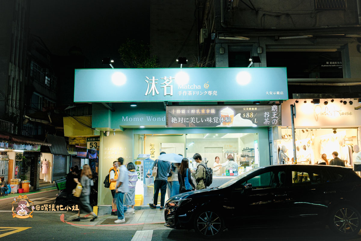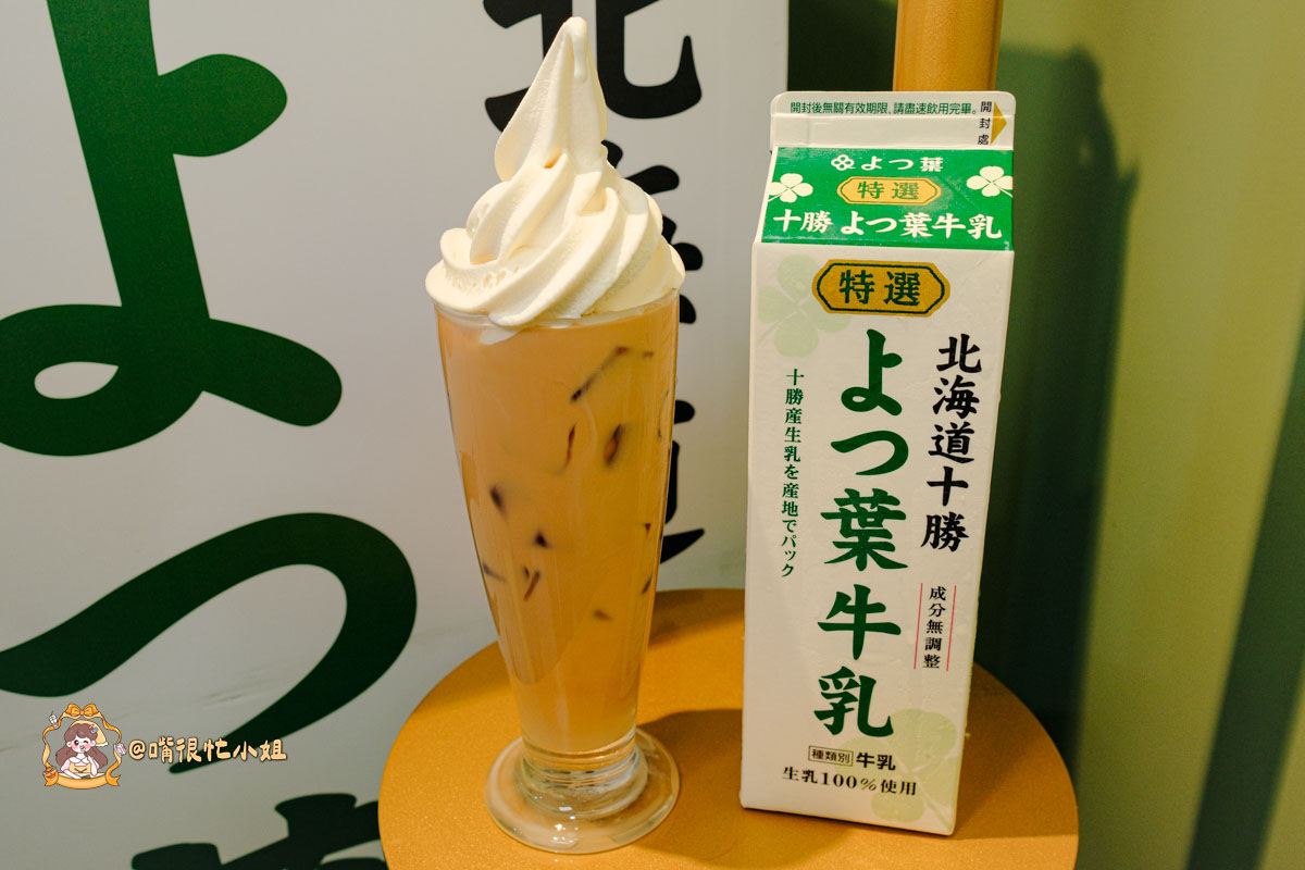 夜晚的大安路上,沫茗手作茶的抹茶綠招牌在燈光下特別顯眼。店內是木質吧台與小巧座位區,溫馨又有日本茶屋的氛圍。一走近就會看到門口那罐巨大的「北海道十勝よつ葉牛乳」模型,幾乎成了店裡最可愛的招牌。不只是裝飾,它也象徵著店家對「原料」的堅持——所有鮮奶系列飲品全都採用這款北海道十勝鮮乳。