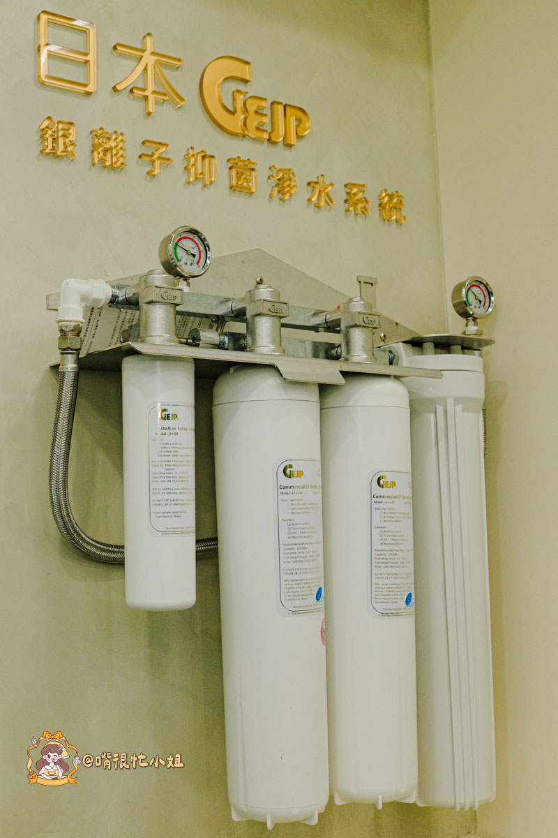 櫃台內一字排開的設備乾淨俐落,最吸睛的就是牆上那排「日本GEJP銀離子淨水系統」。這套淨水設備能有效去除雜質與異味,讓飲品入口更乾淨、無雜質。沫茗不只強調原料,連基礎用水都做到最頂。