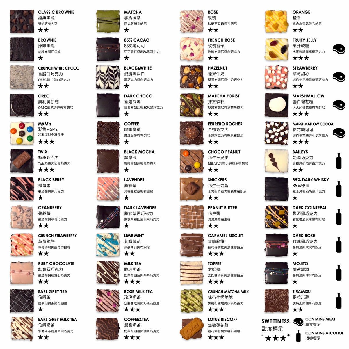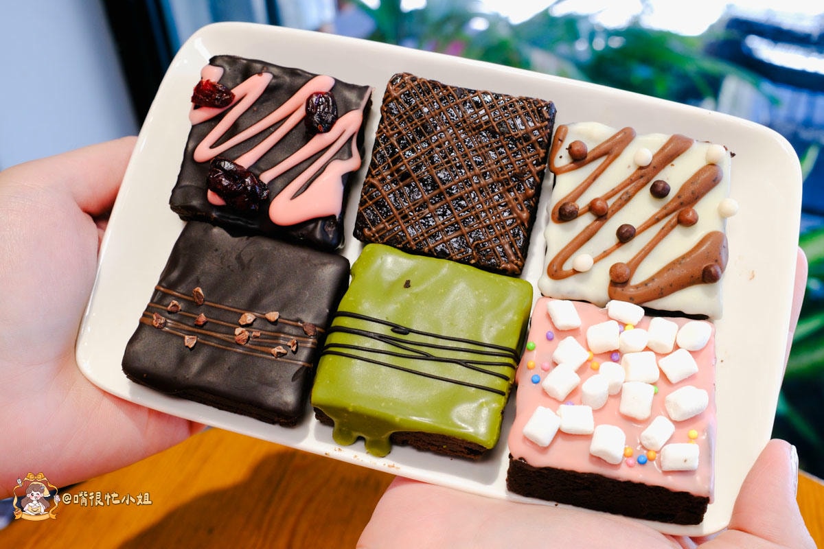 店門口不大,卻很有「西門選物甜點店」的氣氛:櫥窗裡是疊得整整齊齊的布朗尼塊,每一顆都有手繪巧克力線條或果乾、脆球裝飾,像小型展覽。門口與室內有少量座位,點好之後店員會把布朗尼加熱,口感瞬間鬆軟、巧克力香往上冒,下午一杯熱拿鐵配一顆剛加熱的布朗尼,在鬧區裡也能坐著聊天。和周邊多以飲料、鬆餅、可麗餅為主的店不同,這裡把布朗尼做成主題系甜點,口味將近四、五十種,逛完紅樓或電影散場來挑禮盒,選擇障礙也能挑到自己派別。