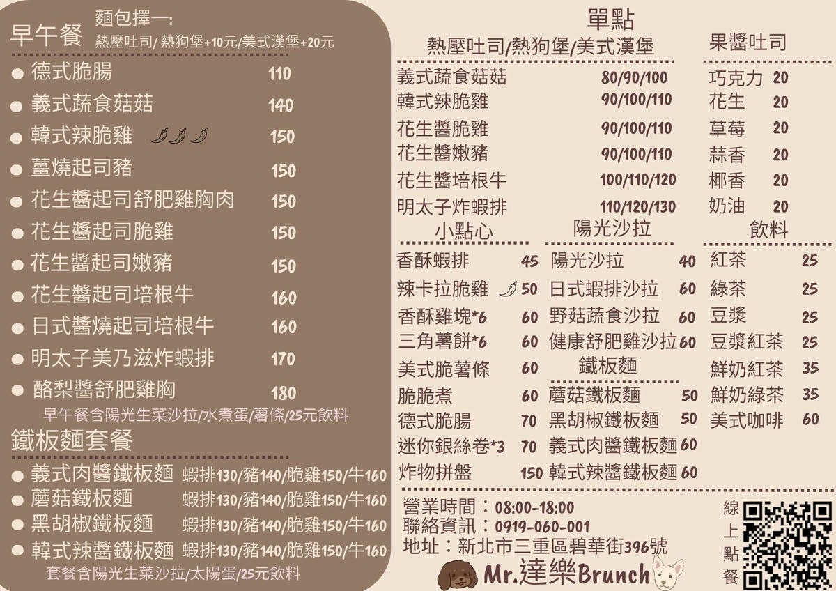 巷弄裡總是藏著讓人想再訪的小店。這間位在三重碧華街的 Mr.達樂 Brunch,招牌不是很大,但走進去就被滿滿的狗狗元素療癒到:桌面是蛋圖案桌布、盤邊放著可愛狗狗造型醬盅,牆面還有店狗的插畫。最大差別是它 寵物友善,而且早午餐一路營業到傍晚,不怕起床晚吃不到﹔開車來也可停 碧華國小地下停車場,步行幾分鐘就到。