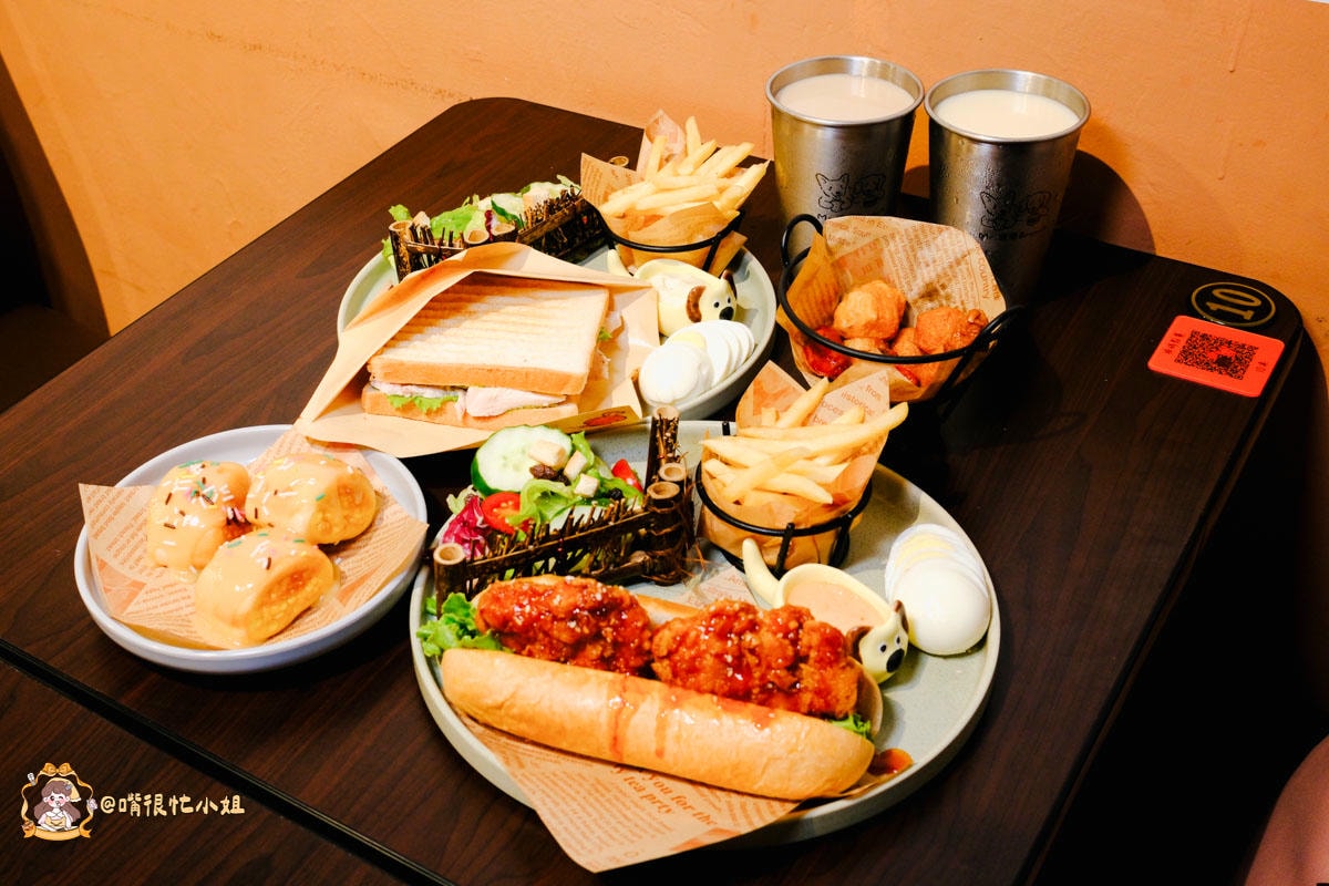主力是 早午餐拼盤 / 熱壓吐司 / 熱狗堡 / 美式漢堡 / 鐵板麵套餐,另外有炸物小點、沙拉與飲品。