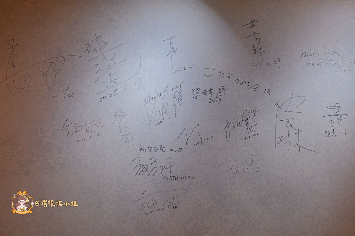 走到二樓後,氛圍比外觀更溫暖一些,最吸睛的是靠近入口的那面「簽名牆」,上面密密麻麻都是來過的藝人與主播播下的簽名,看起來像是台北隱藏版名人聚點,讓整體氛圍多了份故事感。