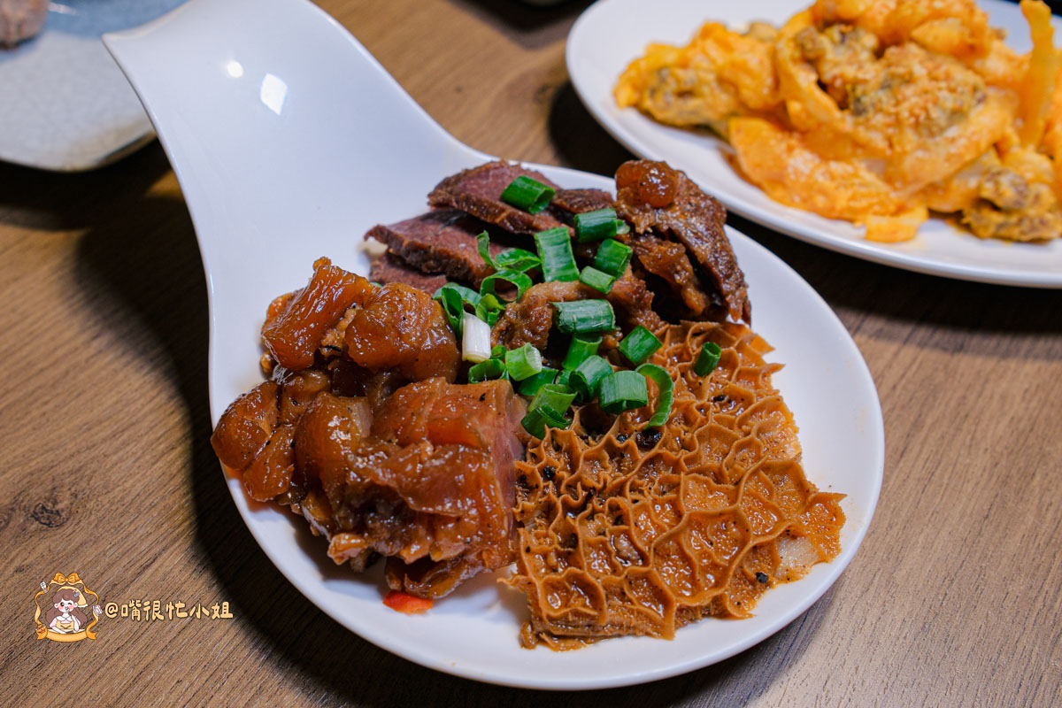 拼盤裡有牛肚、牛筋、牛腱,每一個部位都滷得入味。牛肚帶嚼勁但不難咬,吸飽滷汁後香氣很足。牛筋入口滑而不膩,牛腱片微鹹微麻,咬下去有層層香氣,是很耐吃的那種滷味。