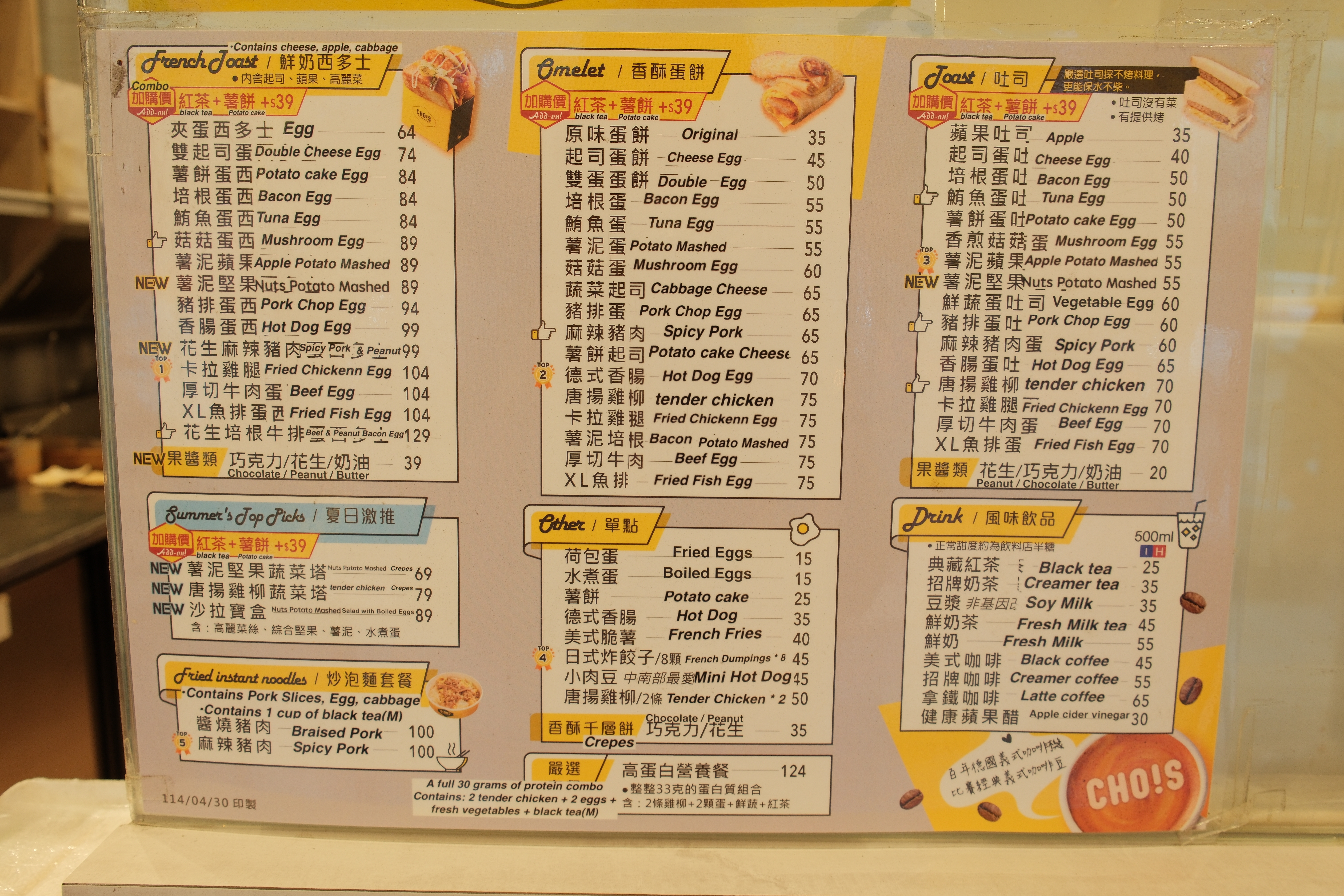丘一司的餐點種類多,主打的「鮮奶西多士系列」是人氣 No.1,還有不少創意口味像「麻辣豬肉炒泡麵」、「薯泥蘋果吐司」這類讓人想一試的品項;與一般早餐店不同的是,這裡的餐點種類更豐富也更創意。