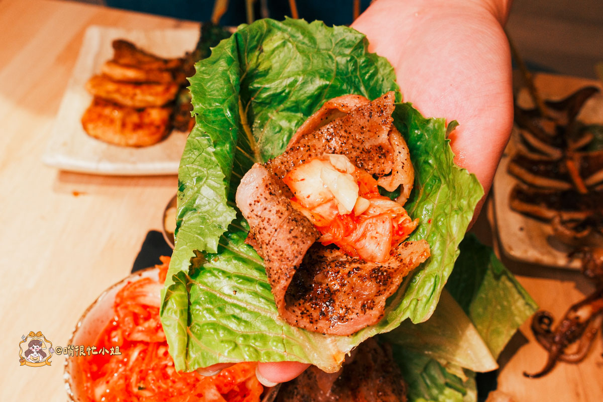 泡菜的酸辣搭配五花的油香,炒香後層次超豐富,加上些許蒜頭包上生菜,吃起來像是台式與韓式的完美結合,也是一道妥妥的下酒菜之一。