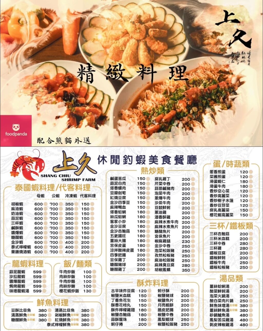 上久的餐點選擇比我預期更豐富,從泰國蝦料理、龍蝦粄條、熱炒、炸物、蔬菜、湯品到麵飯通通都有,整份菜單攤開來看真的滿驚人。價格也算親民,尤其是三〜四個人一起來釣蝦兼吃飯,分下來非常划算。