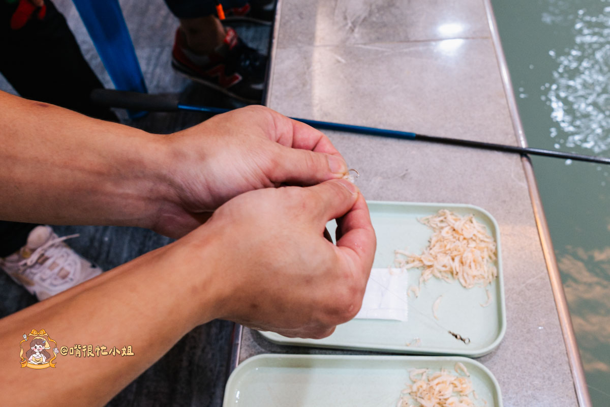 新手來其實完全不用怕丟臉,因為這裡的蝦子活動力好、數量多,第一次來也能輕鬆上手;如果不知道怎麼裝餌,店員也會現場示範,把小蝦末捏成一小團藏在鉤子上,簡單又好上鉤。