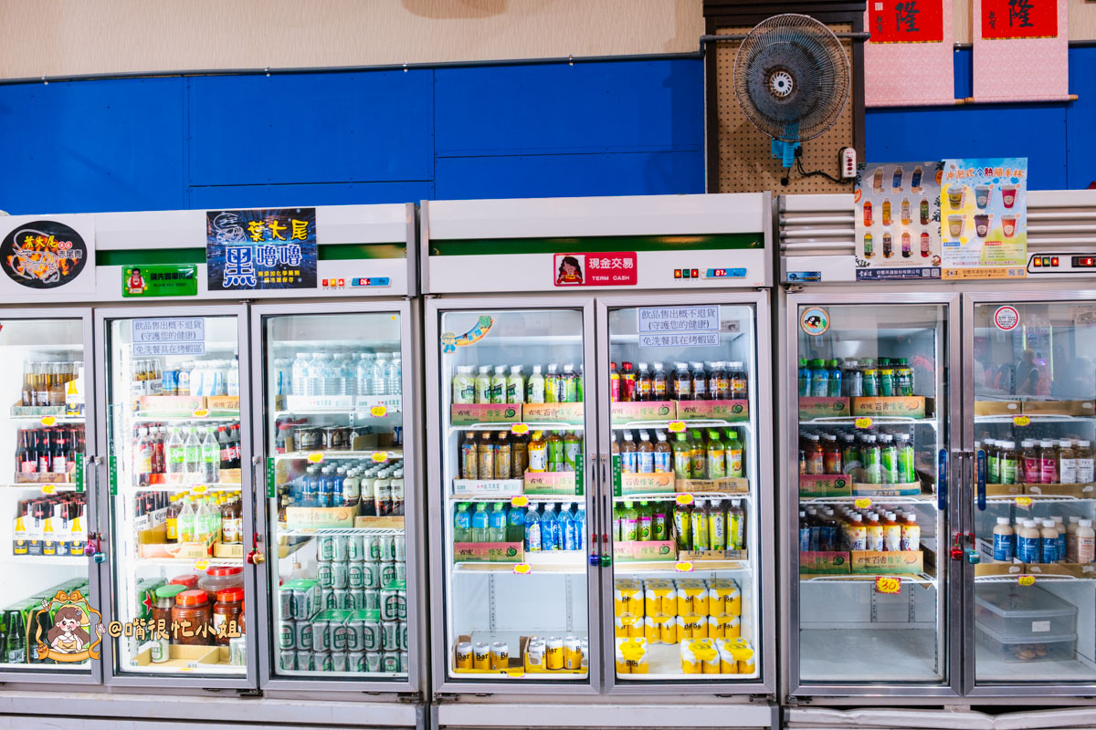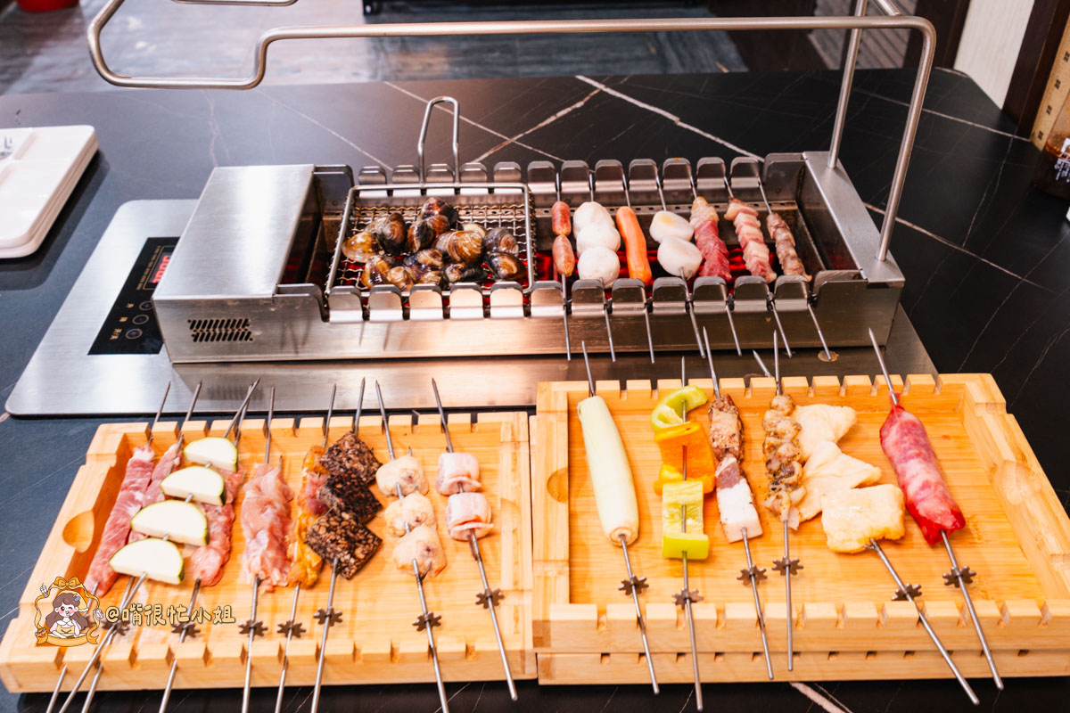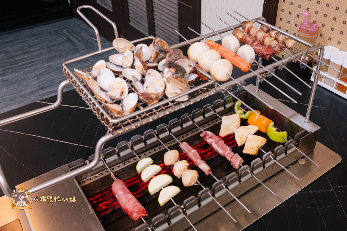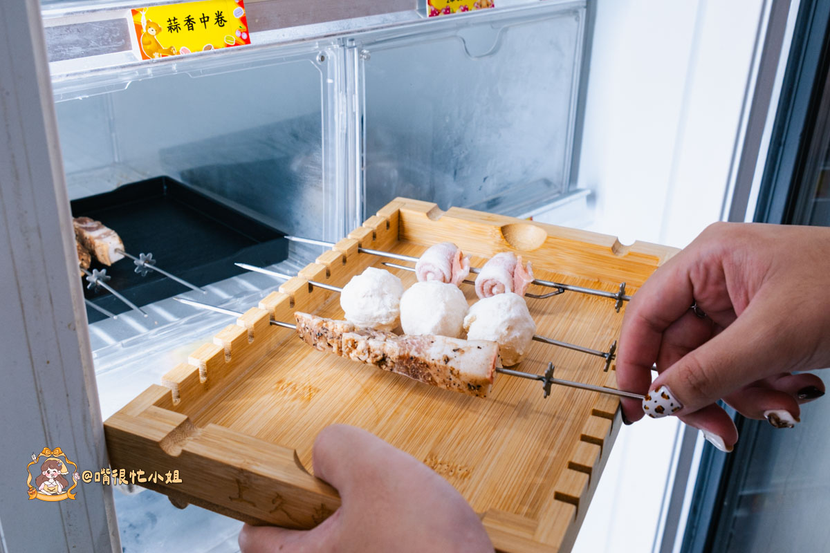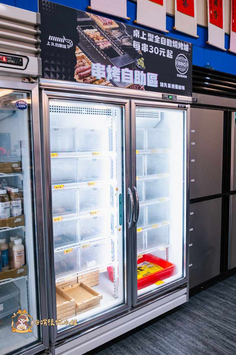 旁邊有整排的透明冰箱,裡面放著各種串好的食材:肉串、香腸、蔬菜、雞腿塊、甜不辣、丸子,甚至連蛤蜊都能烤。每串只要 $30 起,有些像蛤蜊、鮮蝦會比較貴一點,但不會有那種亂喊價的感覺。