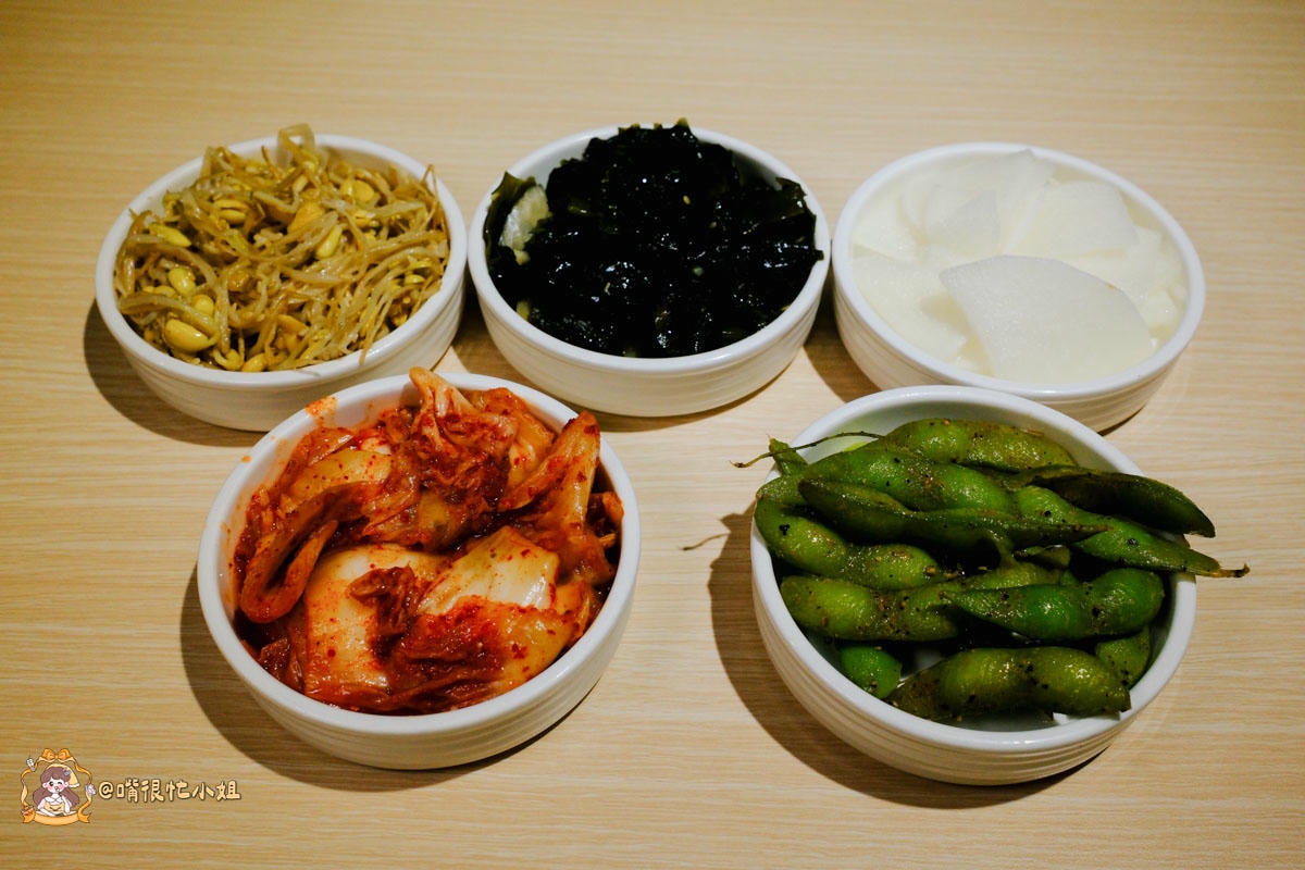 一開始會先上五小碟,包含涼拌豆芽、海帶芽、醃白蘿蔔片、韓式泡菜、椒鹽毛豆;小菜可以一直續盤,這點真的大勝很多韓式烤肉店。